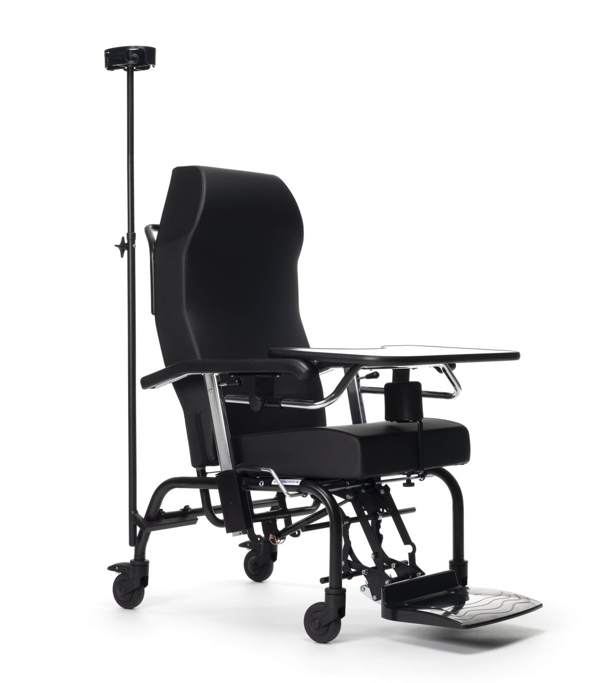 Le porte-sérum se place directement sur le fauteuil médical à l'arrière.