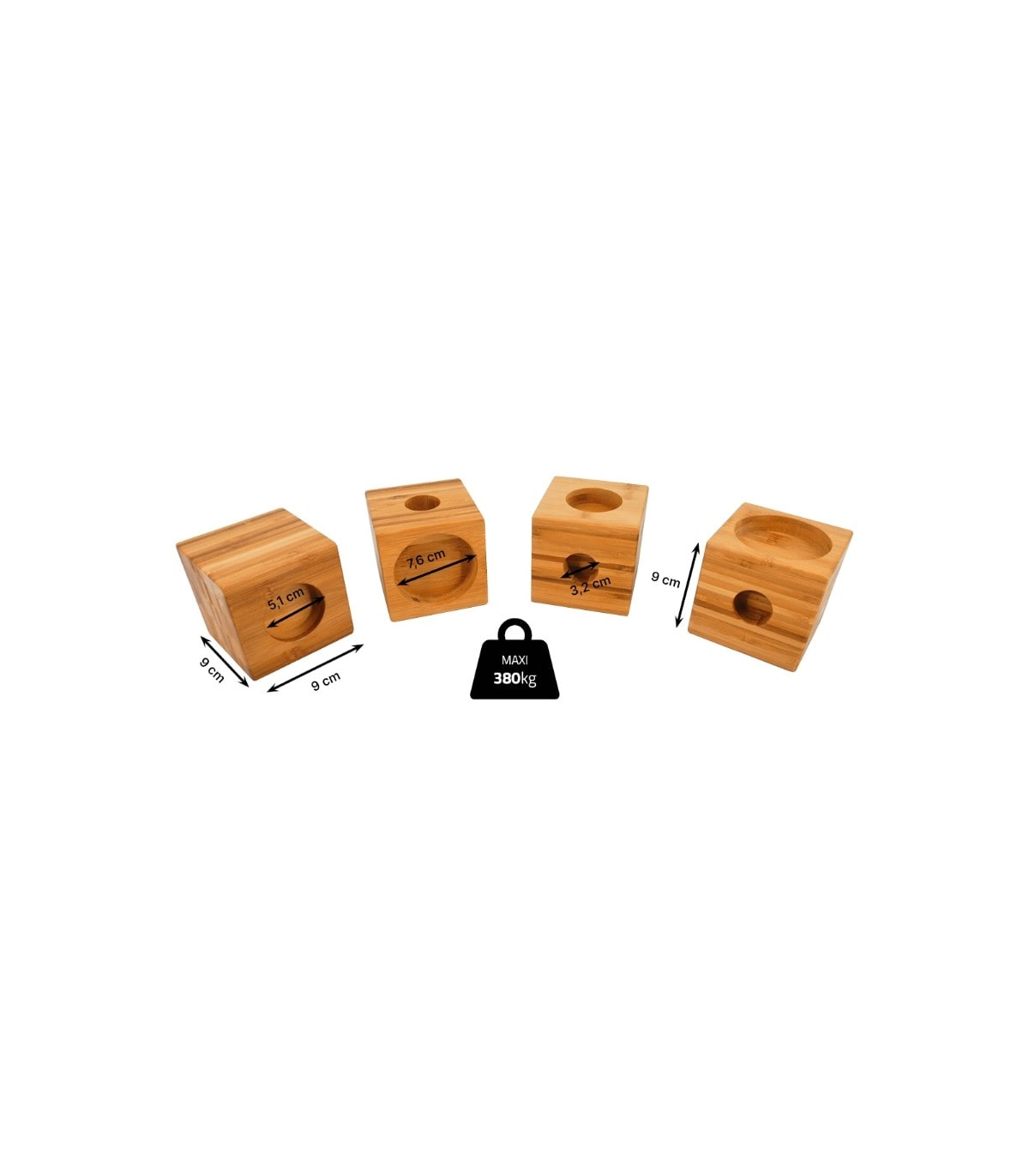 Les cubes sur-élévateurs comportent 3 diamètres différents pour s'adapter à tous les pieds de meubles: 3,2cm; 5,1cm ou 7,6 cm