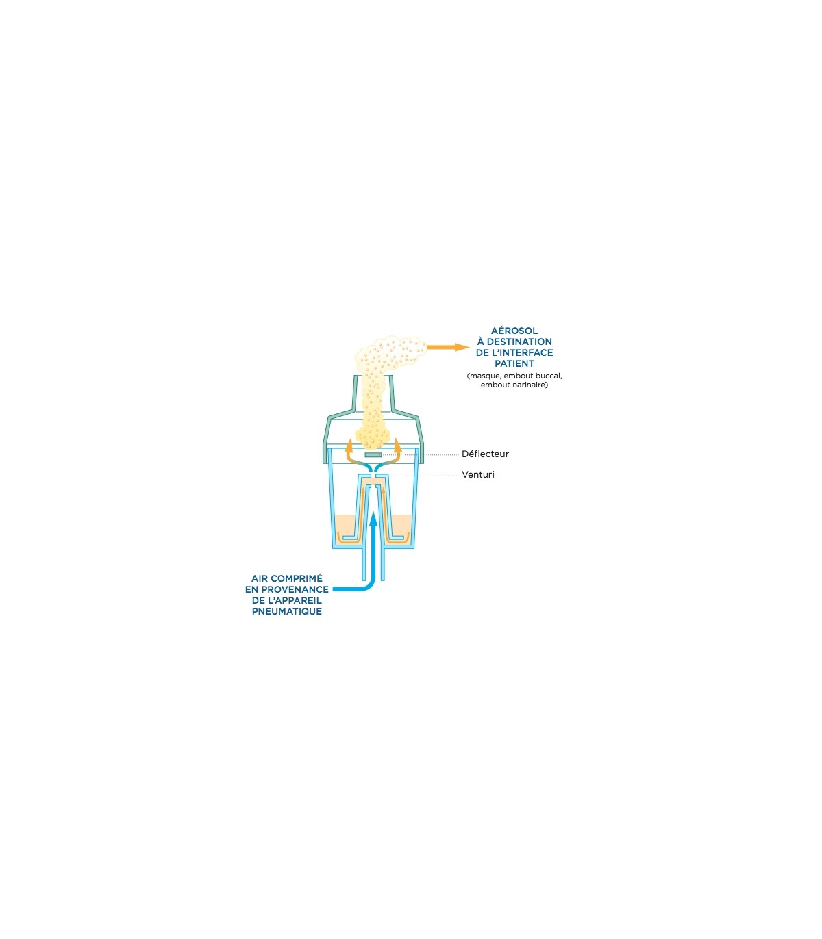 - A l’intérieur du nébuliseur, l’air comprimé crée une dépression et déclenche par effet venturi l’aspiration de la solution médicamenteuse et sa projection contre le déflecteur (ou impacteur).