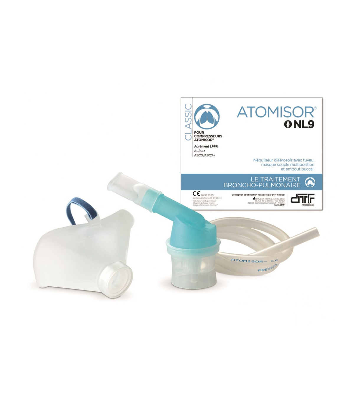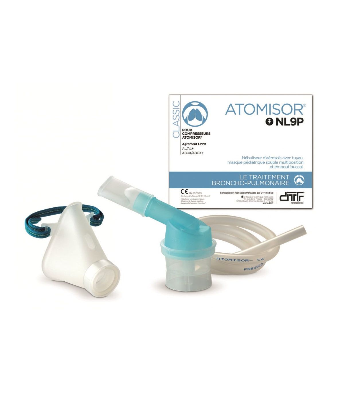 Le kit de nébulisation de chez DTF Médical est livré avec un masque à rotule R (adulte) ou RP (pédiatrique) ou RBB (bébé).