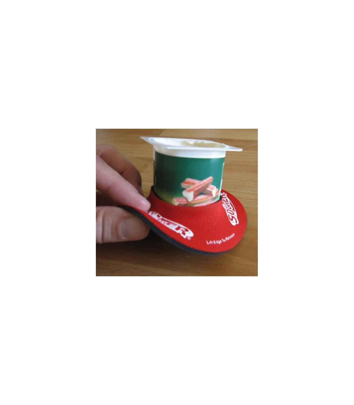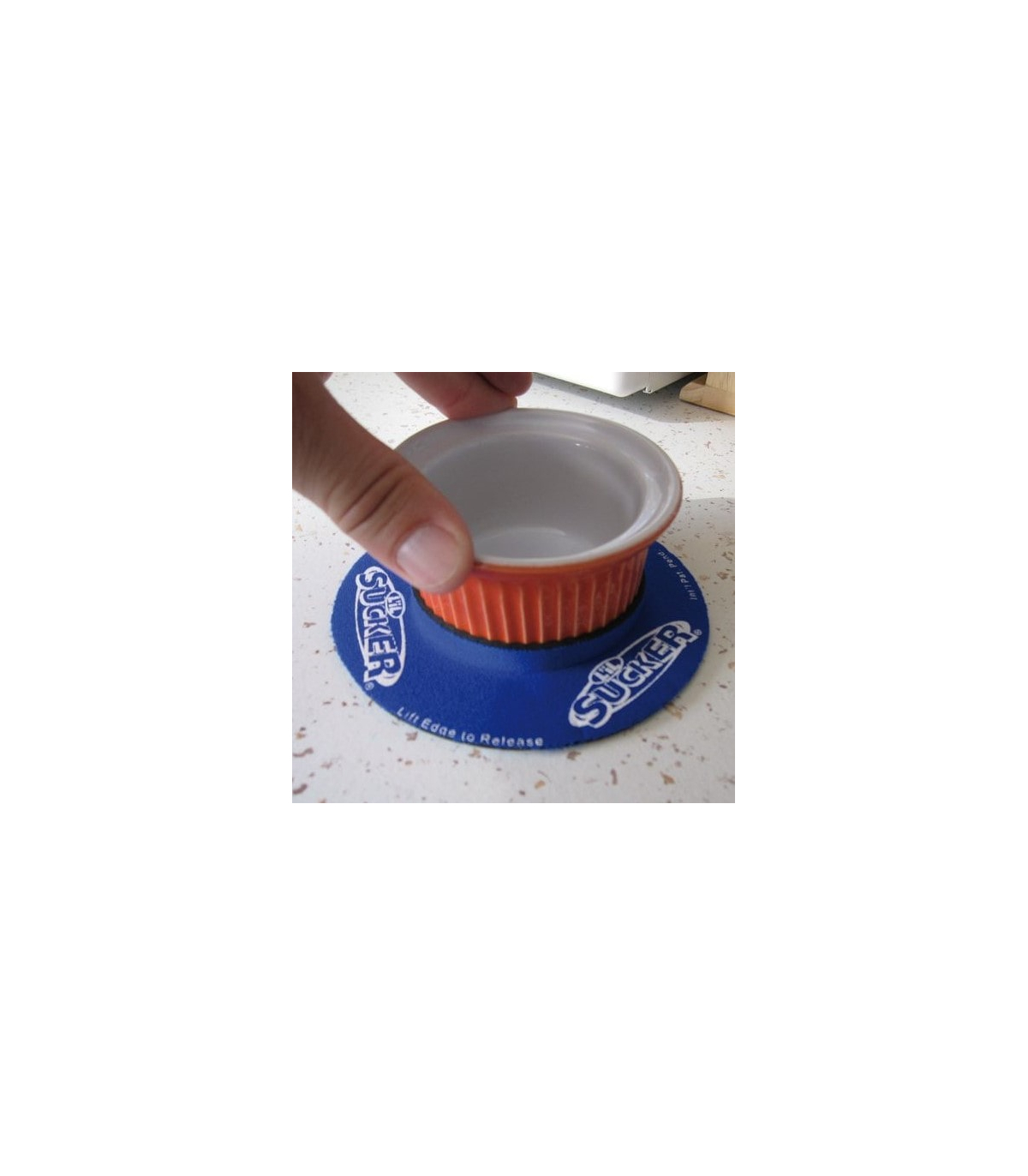 Le support antidérapant Sucker s’enfile à la base du pot de yaourt ou du ramequin et se fixe sur une surface lisse comme une ventouse, empêchant ainsi tout risque de renversement.