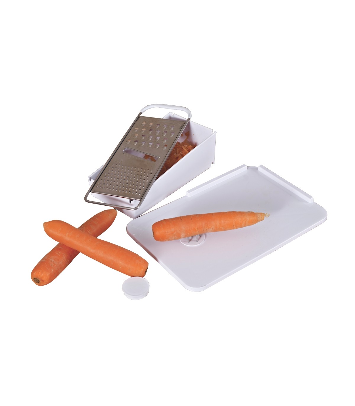 Elle est livrée avec un grattoir permettant de piquer de peler, découper en rondelles ou émincer grâce à ses 3 types de coupe.