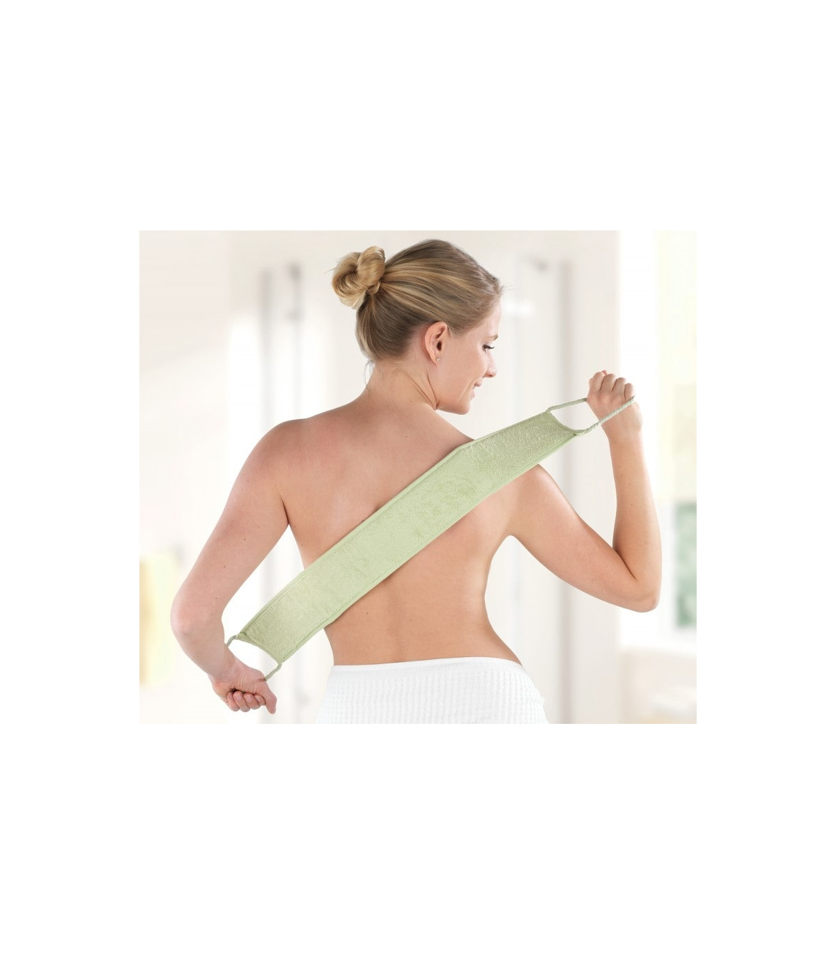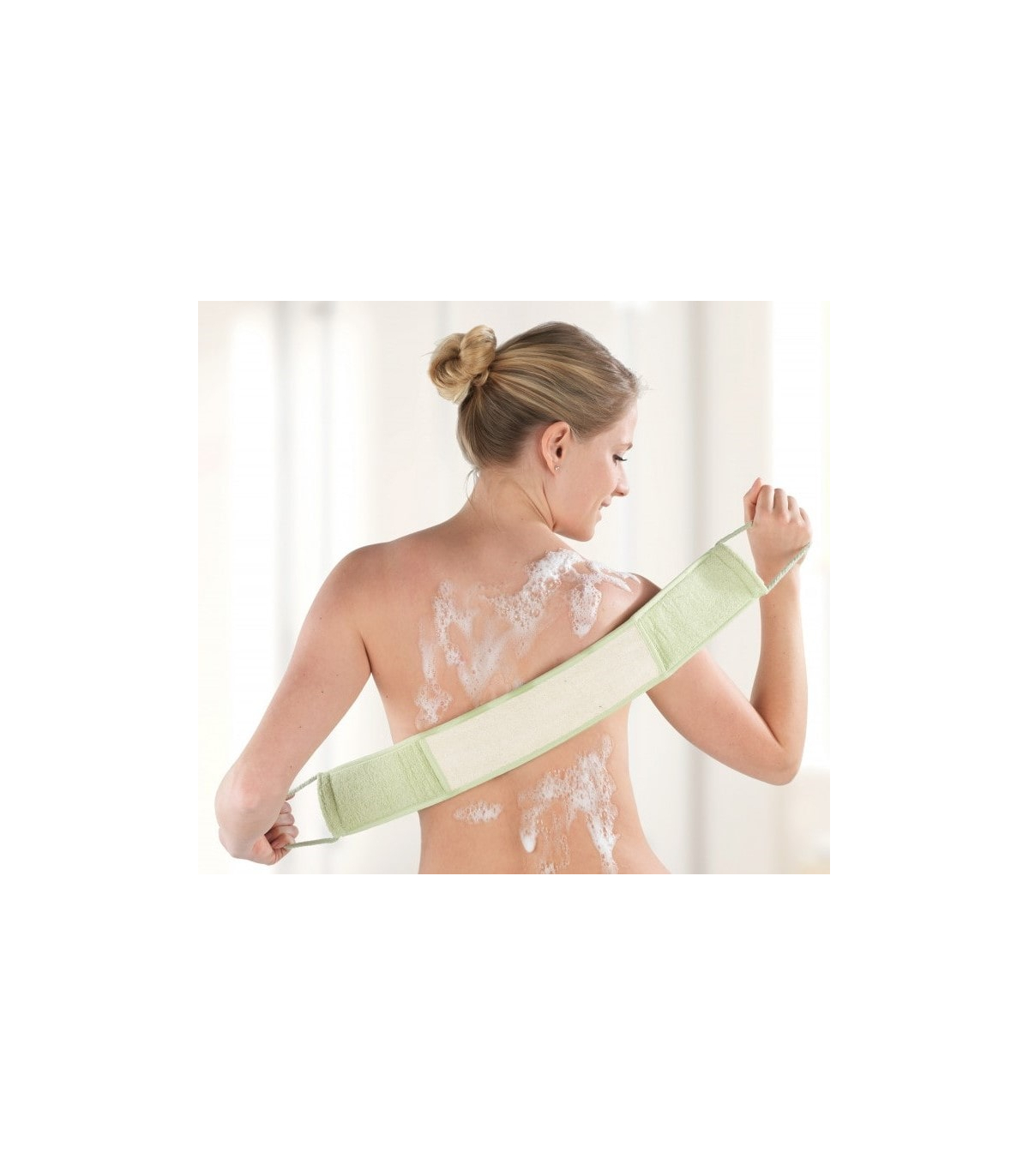 Le côté ultra doux de la sangle lave-dos en tissu éponge bambou-coton permet de savonner ou sécher le dos en toute délicatesse.