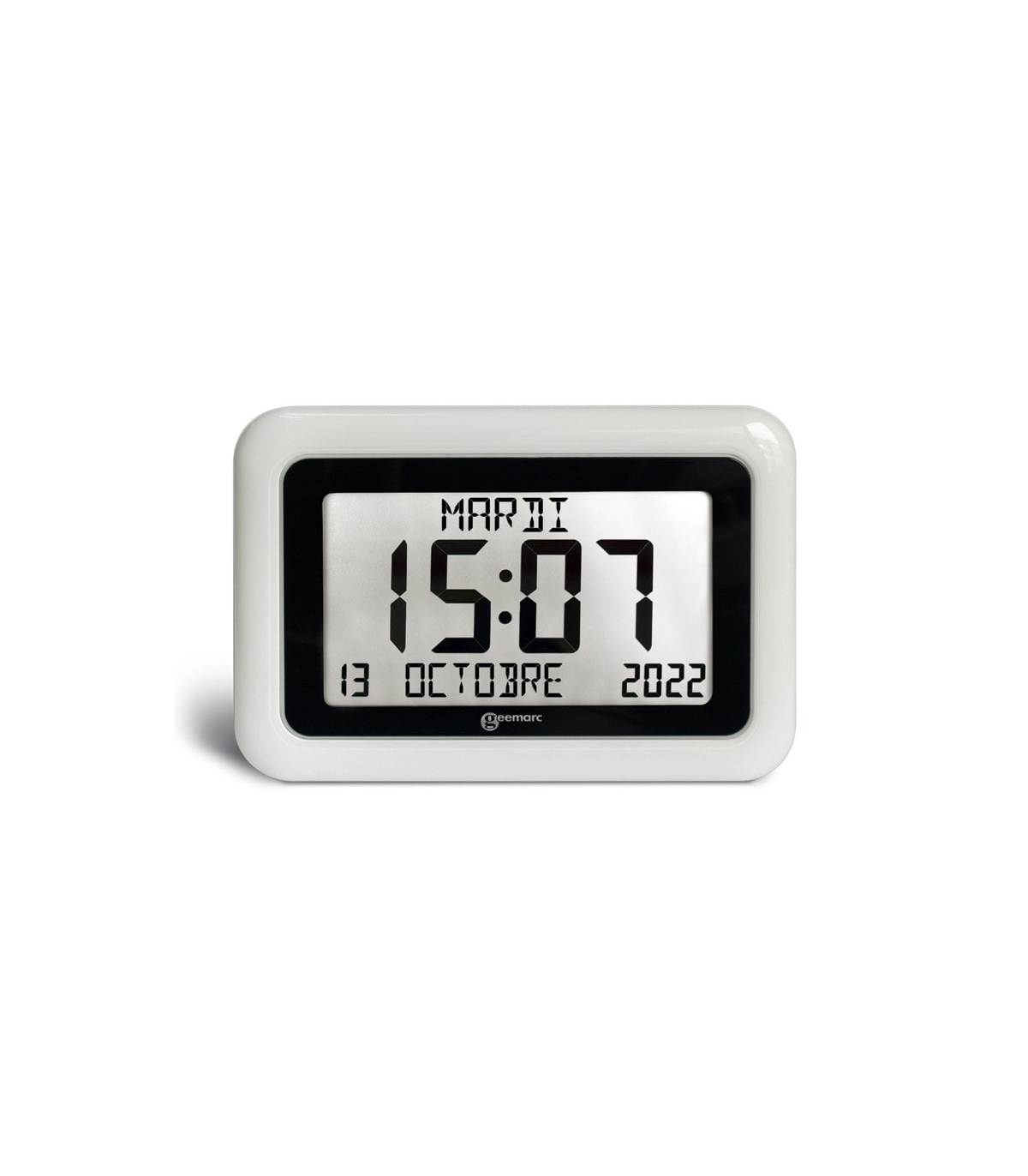 L'horloge calendrier LCD Viso 10 Geemarc est principalement conçue pour les personnes atteintes d'Alzheimer et les personnes avec des déficiences cognitives. Ce dispositif permet d'informer l'utilisateur de la date, l'heure, les minutes, le jour, le mois et l'année.
