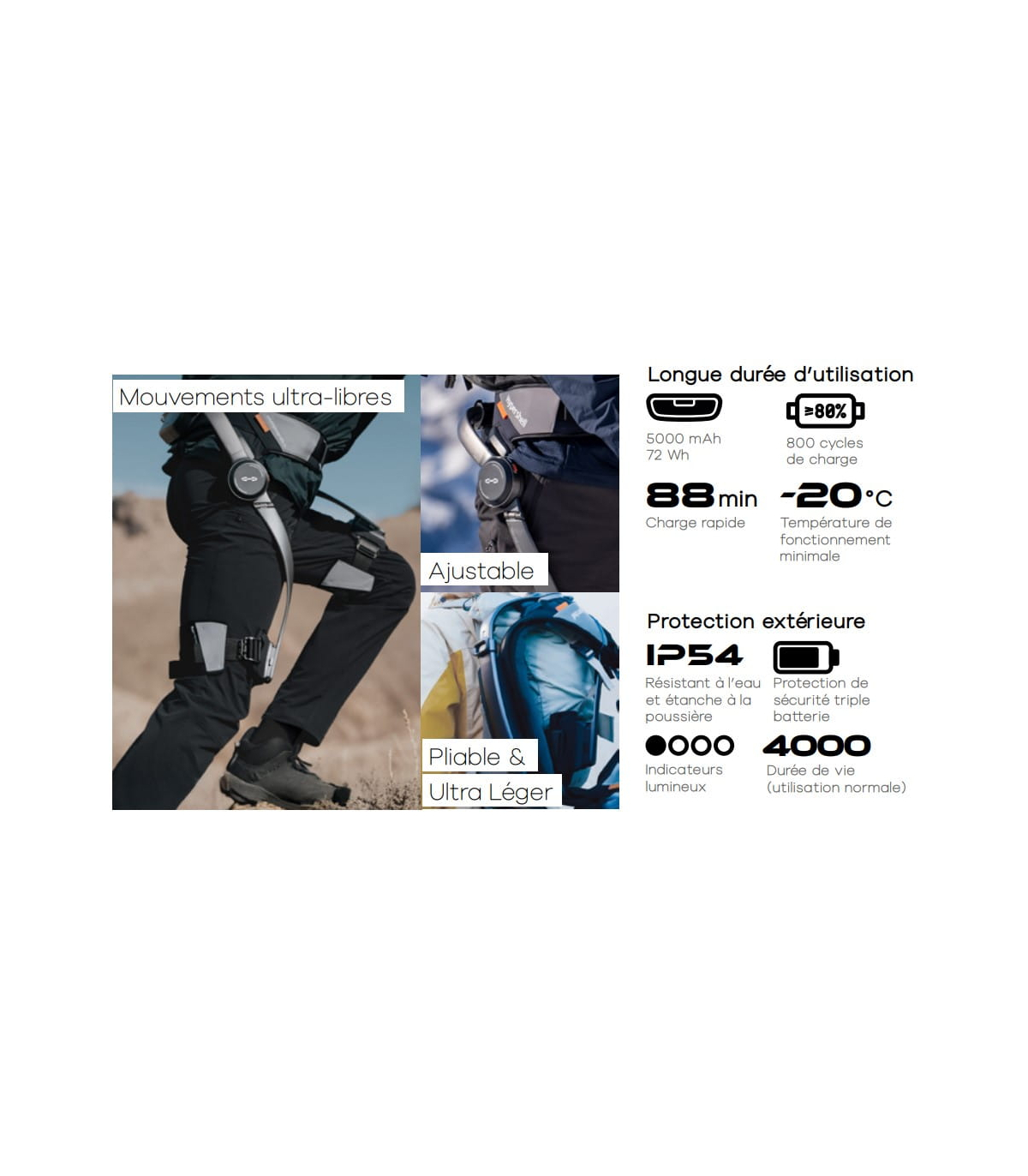 L’exosquelette proposé à un prix attractif fournit une assistance mécanique (jusqu’à 800 W) qui amplifie les mouvements et facilite les efforts. Résultat : plus de vitesse et moins d’épuisement.