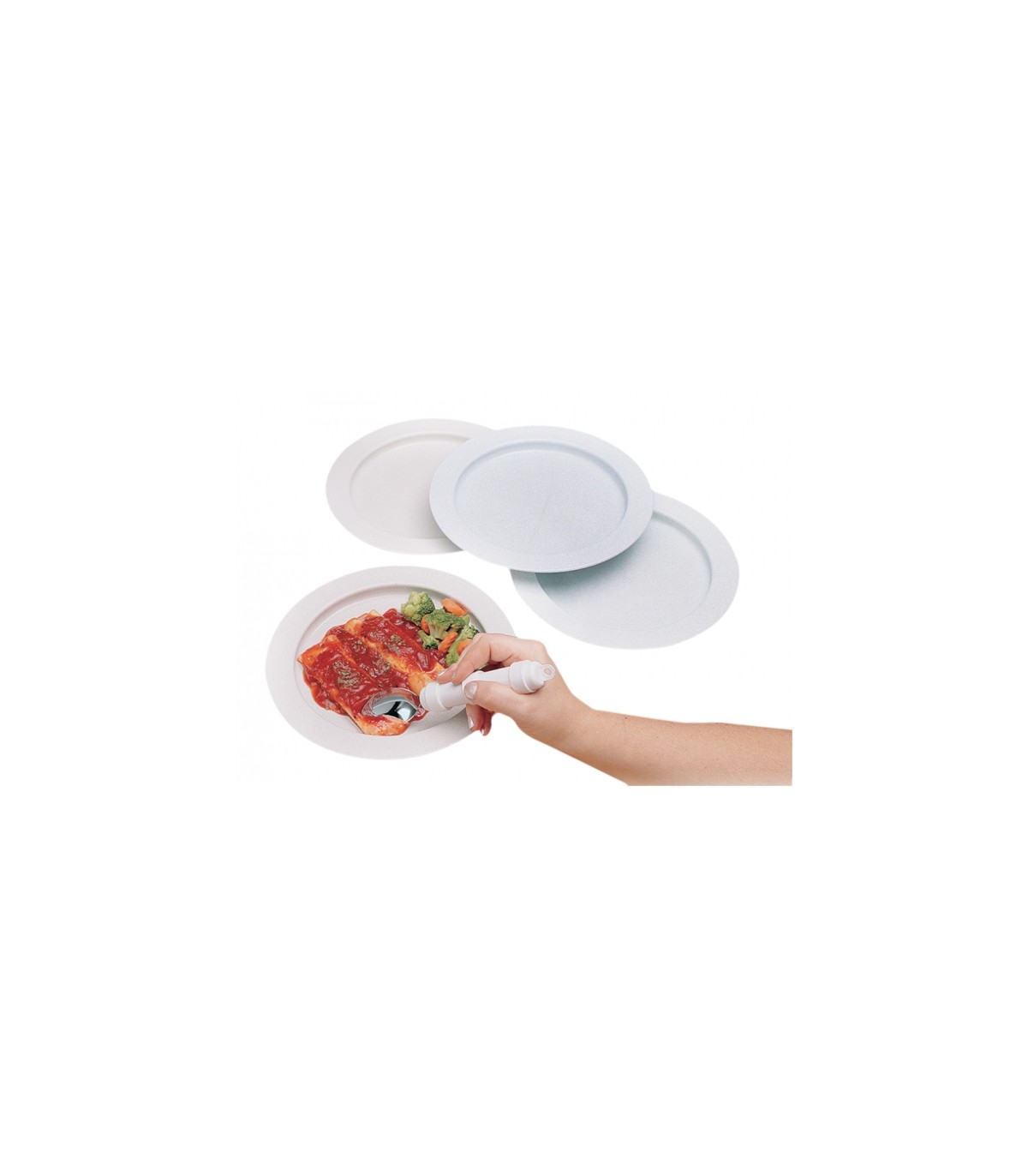 Cette assiette comporte un rebord intérieur permettant au patient de manger d'une seule main.