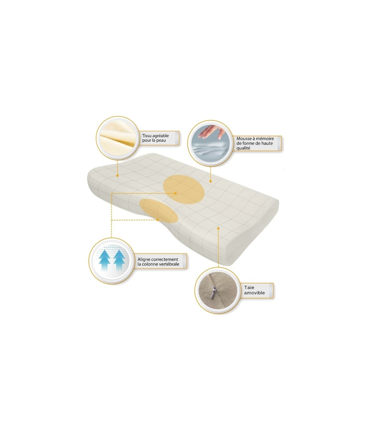 Sa forme anatomique profilée assure un alignement optimal de la tête et de la colonne cervicale pendant le sommeil, contribuant ainsi à réduire les torsions et les tensions au niveau du cou.