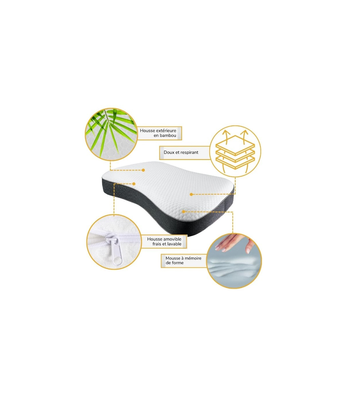 Le coussin en mousse à mémoire de forme proposé à un prix attractif, est muni d'une housse douce et respirante en bambou (40 % bambou et 60 % polyester), qui protège l'oreiller contre les bactéries et les acariens, tout en assurant une régulation efficace de la température. La housse en bambou est non irritante, offrant un confort agréable au quotidien.