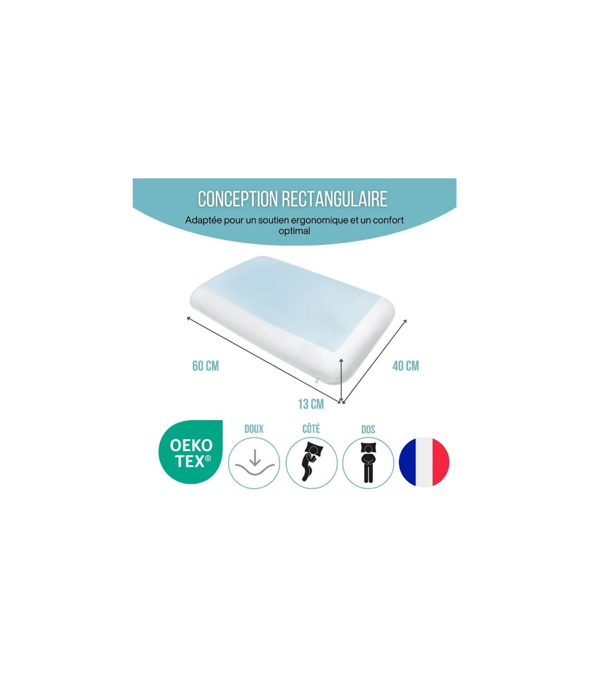 L’oreiller à mémoire de forme Confort Gel présente des dimensions standards de 60 x 40 cm, adaptées à la plupart des taies et literies classiques.