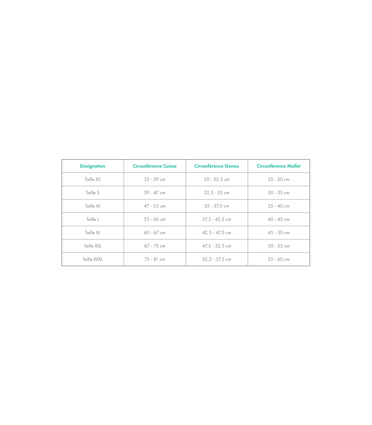 | Désignation | Circonférence Cuisse | Circonférence Genou | Circonférence Mollet |