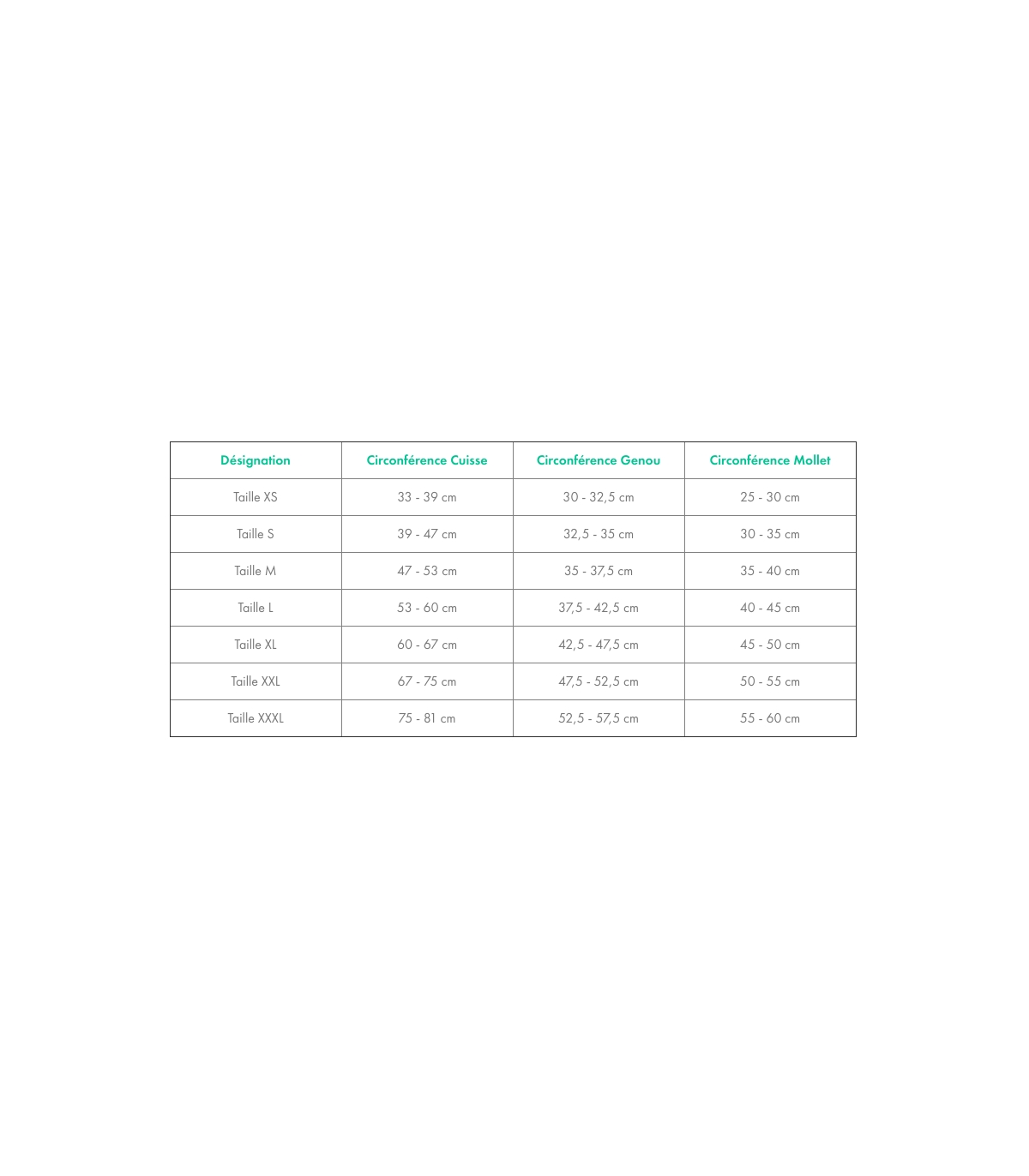 Désignation Circonférence Cuisse Circonférence Genou Circonférence Mollet