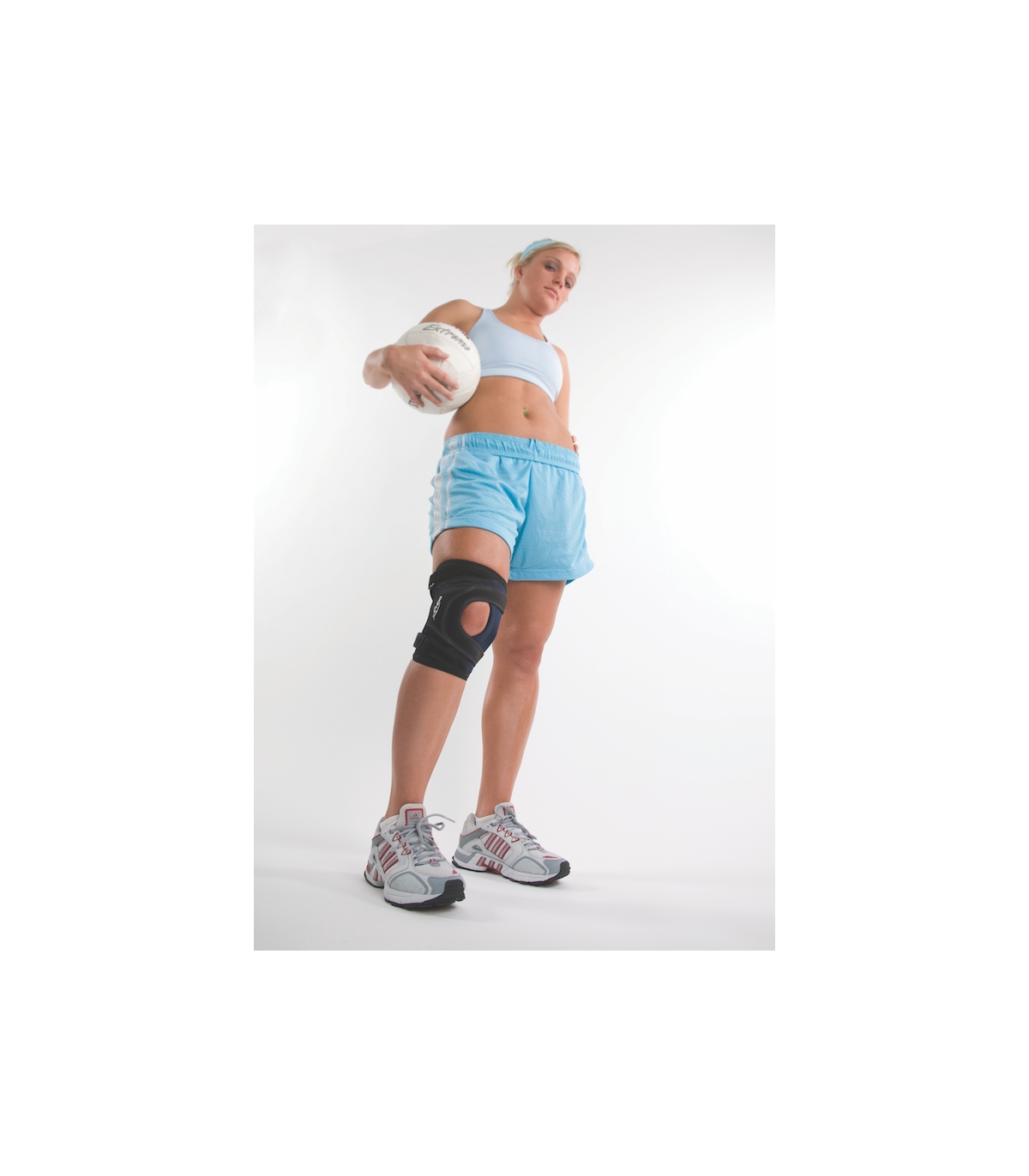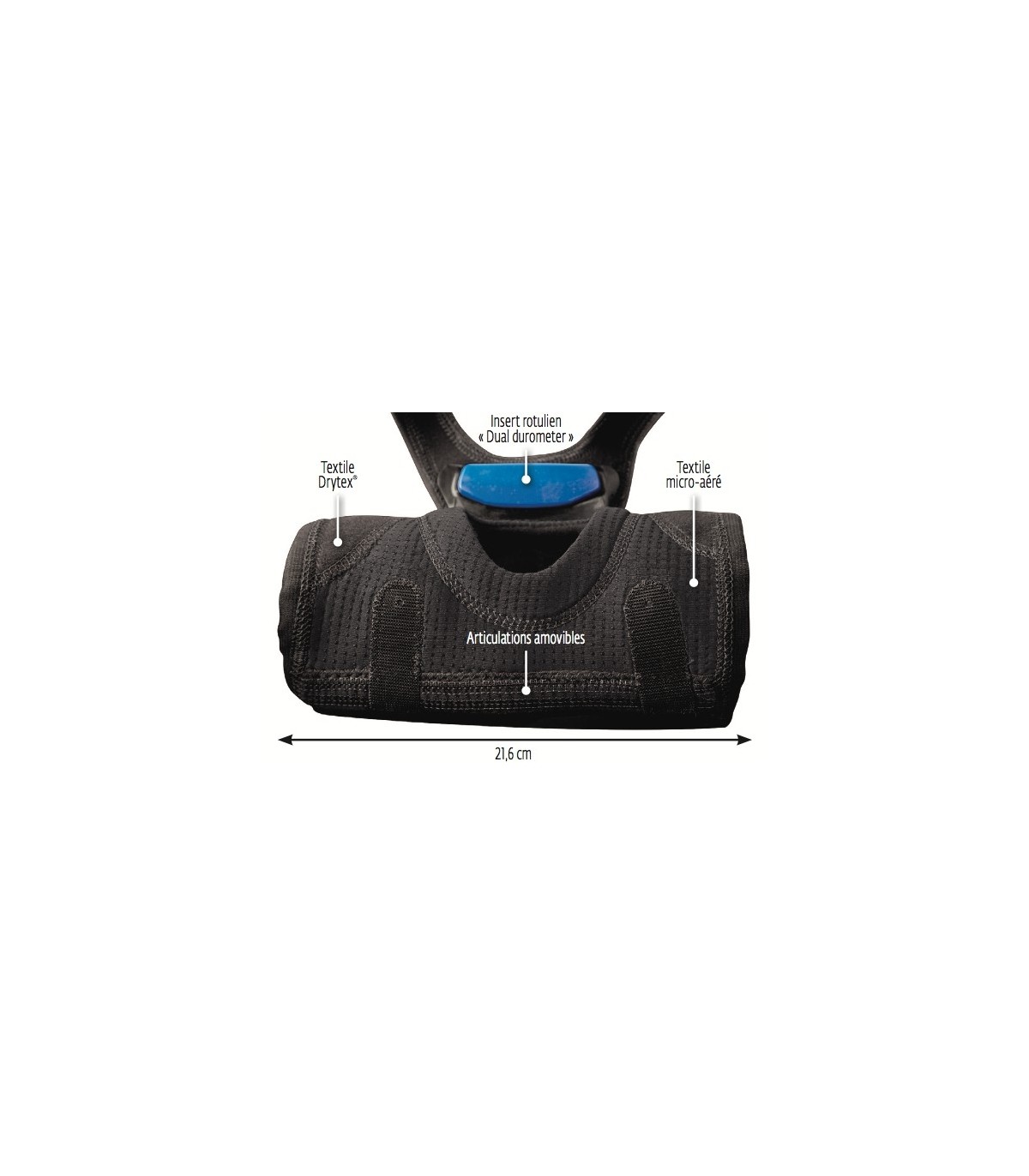 Elle comporte des sangles dédoublées en "Y" pour appliquer une traction dynamique au-dessus et en dessous de la rotule.