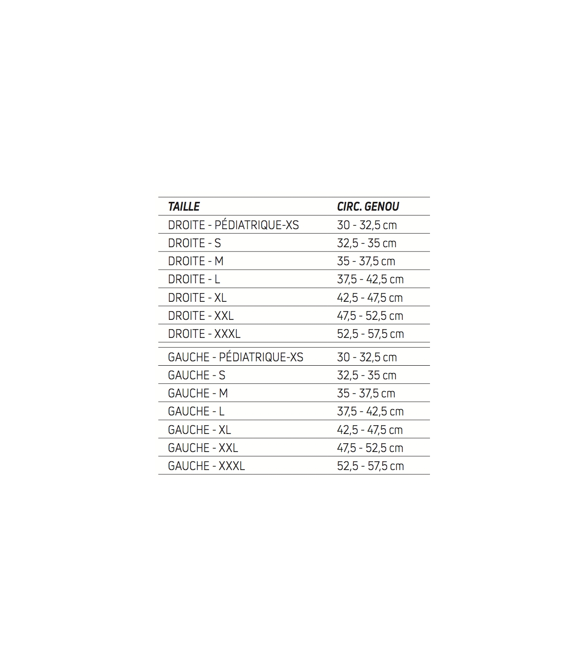 De plus, l'attelle de genou Tru-Pull Lite est un modèle latéralisé, disponible en 7 tailles allant de la taille pédiatrique-XS à la taille XXXL.
