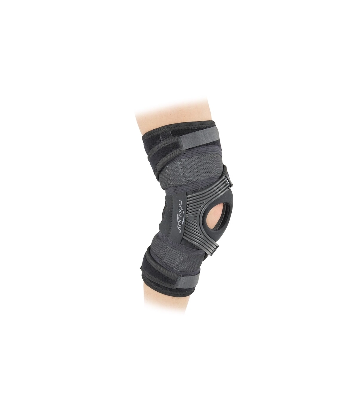 L'attelle rotulienne Tru-Pull de chez Donjoy est équipée d'un système de traction comprenant une sangle au-dessus et en dessous de la rotule, afin de procurer une forte traction dynamique durant l'extension du genou.