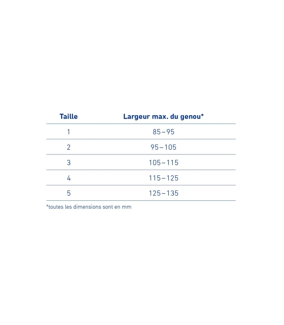 Taille Largeur max. du genou