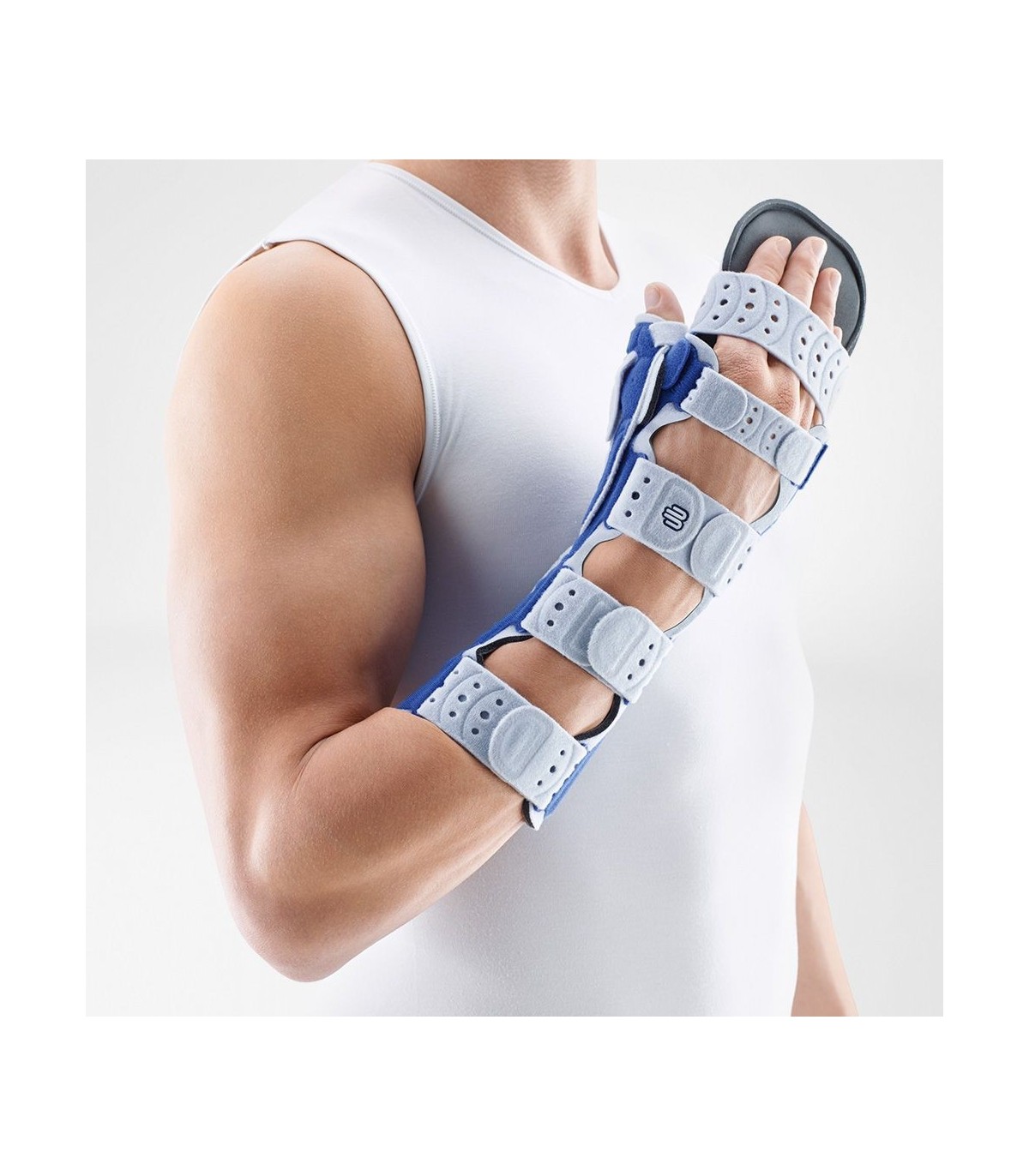 L'attelle ManuLoc Rhizo long Plus a pour rôle d'immobiliser l'ensemble de la main et les parties de l'avant-bras. Elle comporte également un support pour doigt amovible et une ouverture pour le pouce.