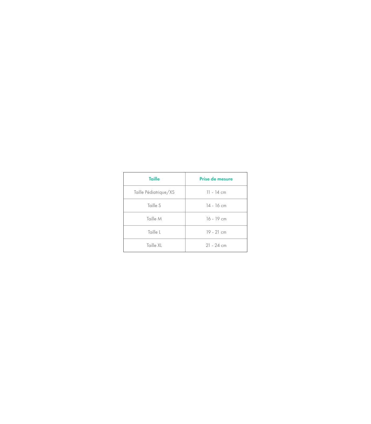 | Taille Pédiatrique/XS | 11 - 14 cm |