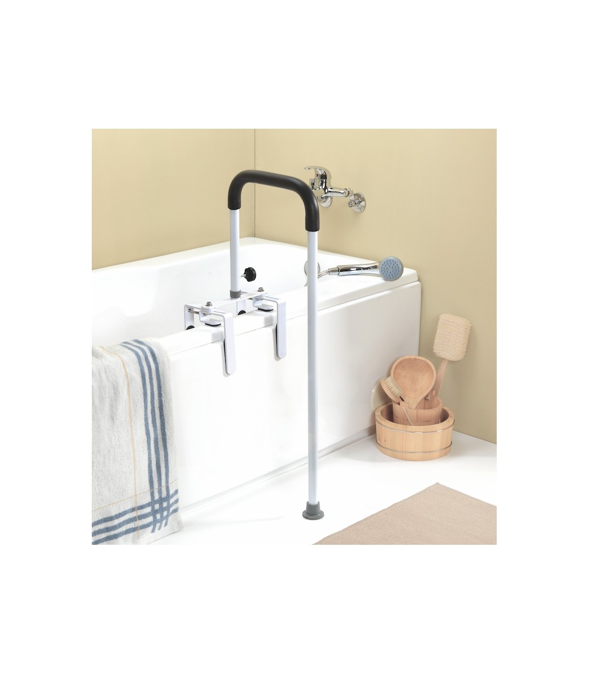 La barre d'appui sur pied Bali proposée à un prix attractif se fixe simplement sur le rebord de votre baignoire à l'aide de 2 mâchoires capitonnées robustes.