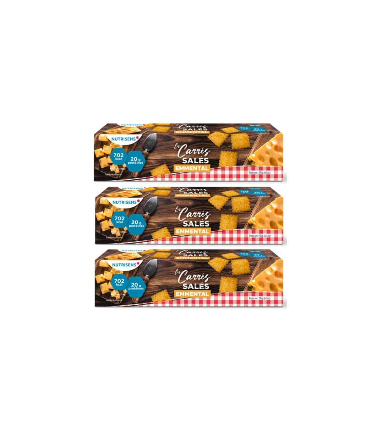 Les carrés salés à l'emmental Nutrisens sont des biscuits hyperprotéinés qui apportent aux personnes âgées les besoins nutritionnels dont ils ont besoins quotidiennement. Ce produit de nutrition est une denrée alimentaire adaptée aux patients dénutris ou risque de dénutrition.