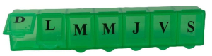 Le pilulier est une boîte compartimentée qui permet de répartir les comprimés dans des cases dans le but de faciliter la prise de médicaments.