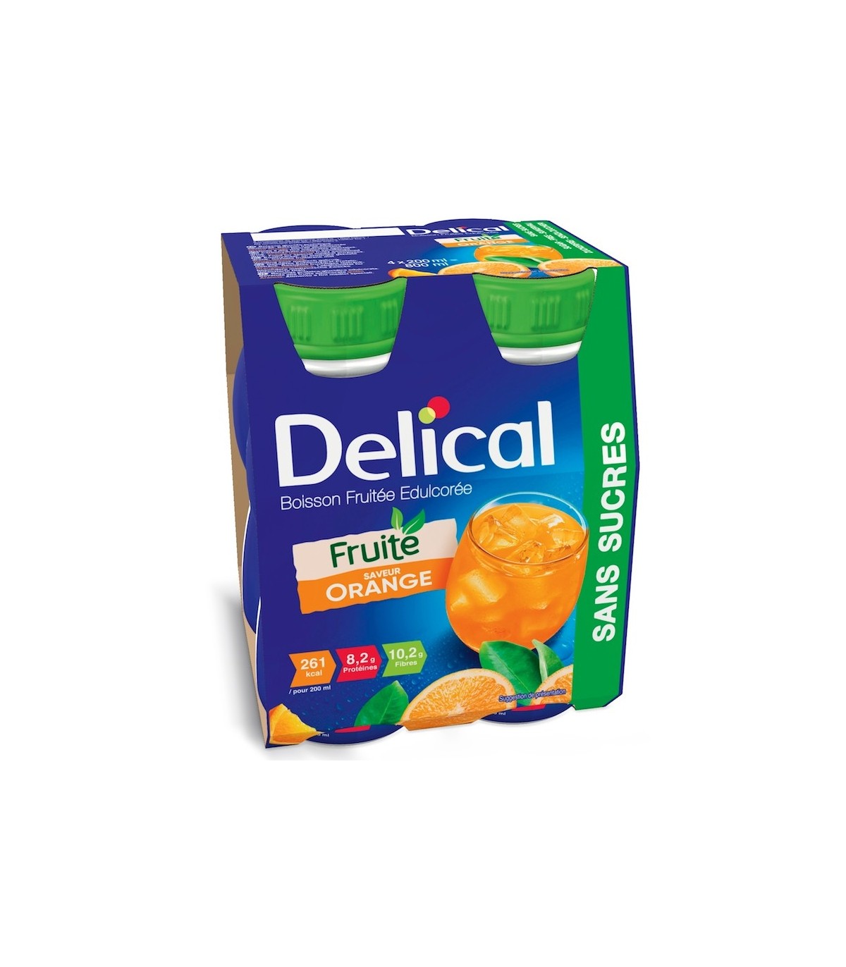La boisson fruitée Edulcorée sans sucres de chez Delical est une denrée alimentaire destinée à des fins médicales spéciales. Ce produit à base de jus de fruit concentré comporte une faible teneur en sucres.