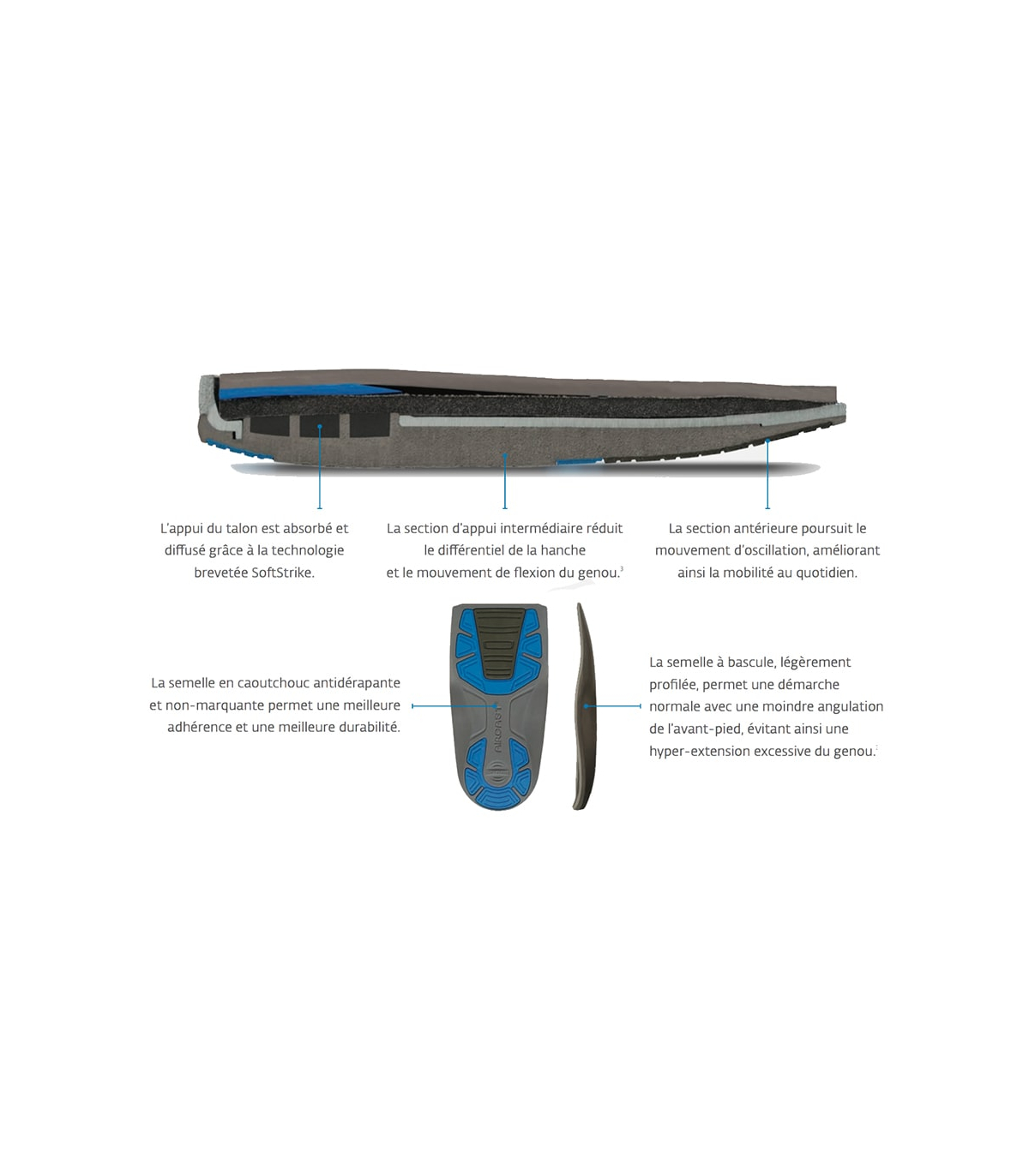 Celle-ci est munie d'une semelle "Softstrike" permettant d'absorber les chocs, de réduire la charge au niveau du talon et d'atténuer les forces d'impact.