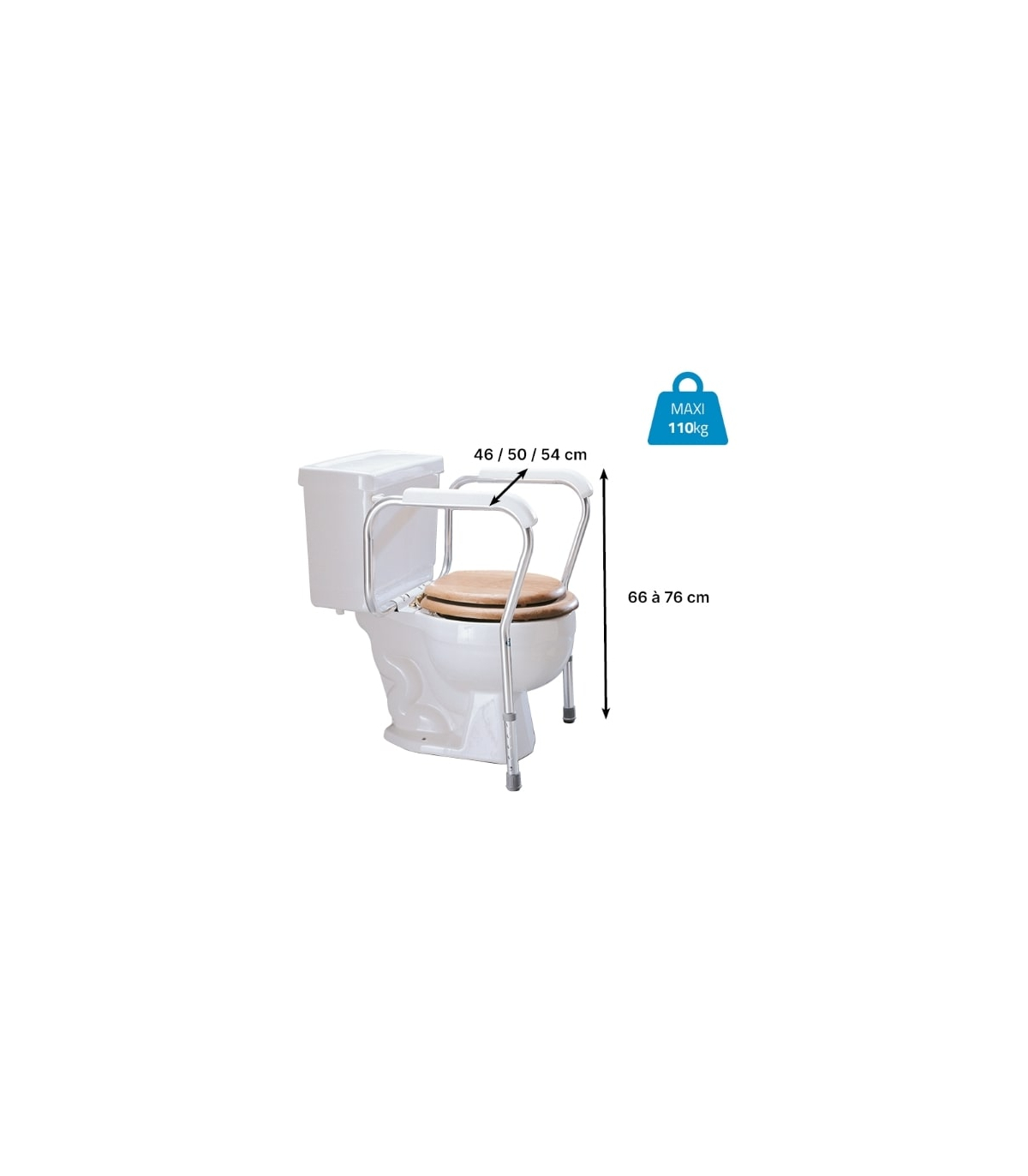 Pour une meilleur adaptation à la morphologie de l'utilisateur, la hauteur et largeur du cadre sécurisé son réglables. La largeur est réglable de 46 à 54 cm et la hauteur de 66 à 76 cm. Très pratique, ce cadre de toilettes s'adapte parfaitement à différentes configurations de WC. Cela assure une installation sécurisée et personnalisée, répondant ainsi à vos besoins spécifiques.