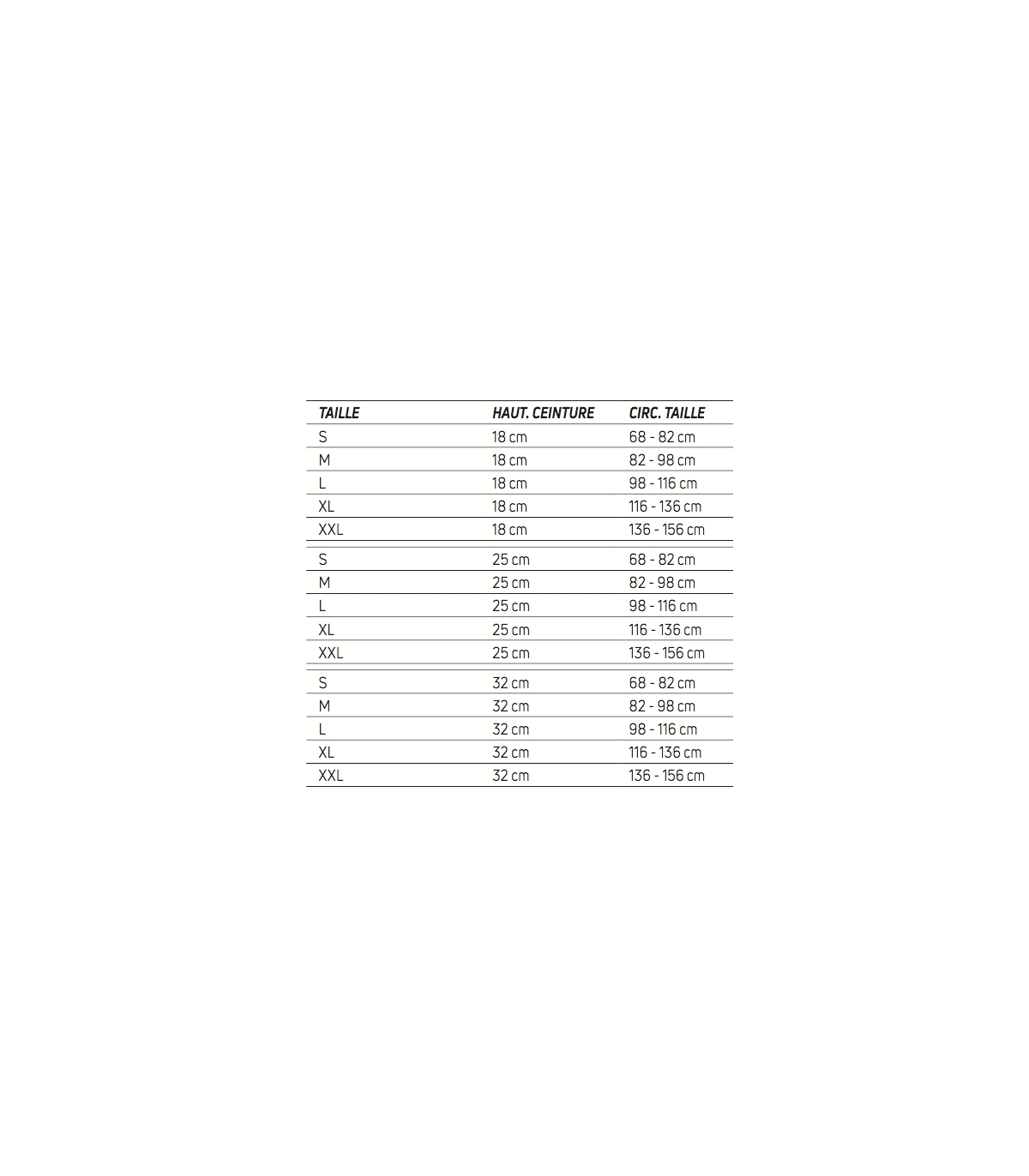 De plus, la ceinture Abdostrap II est un modèle mixte, disponible en 3 hauteurs (18, 25 et 32 cm) et 5 tailles allant de la taille S à la taille XXL.