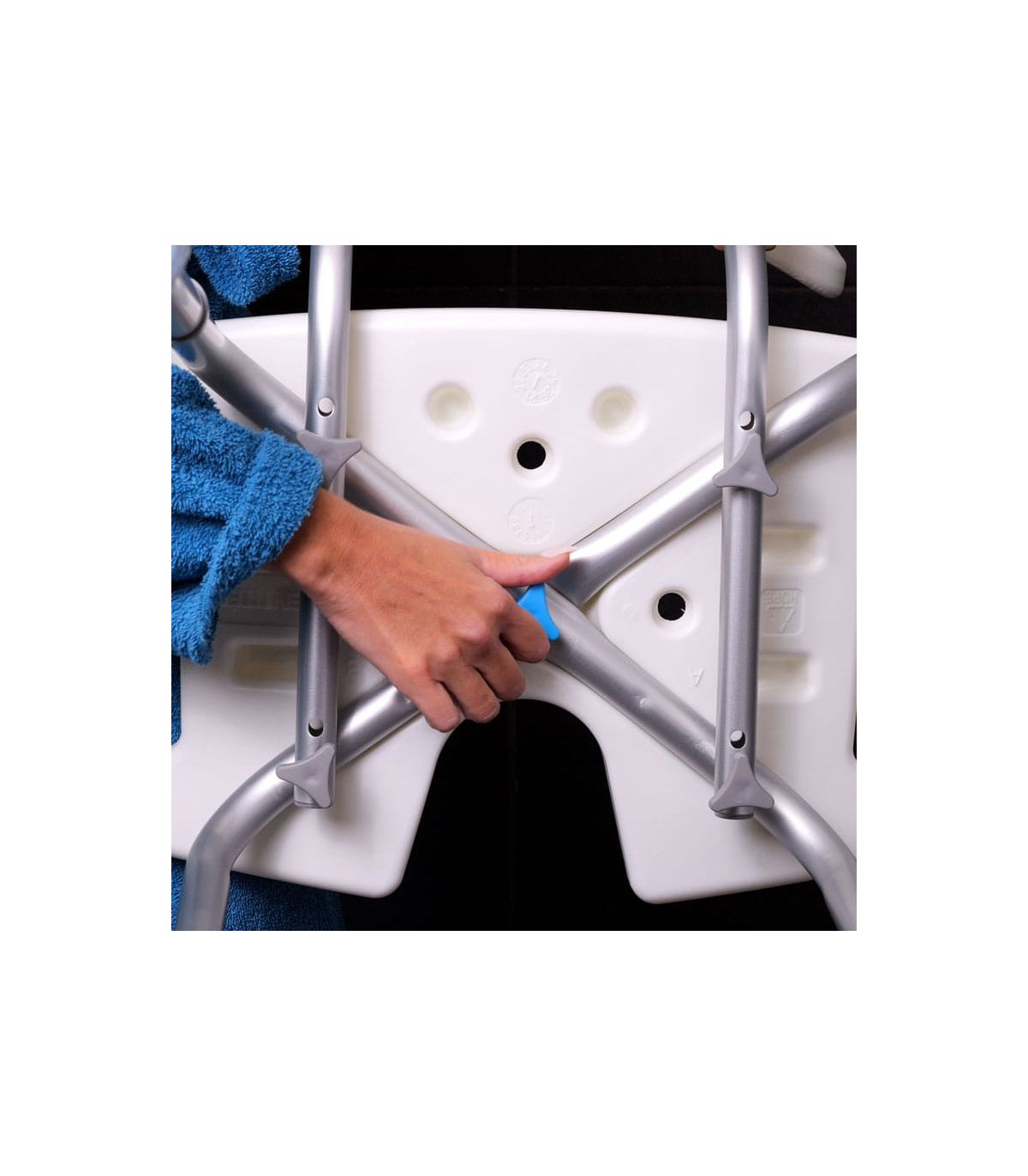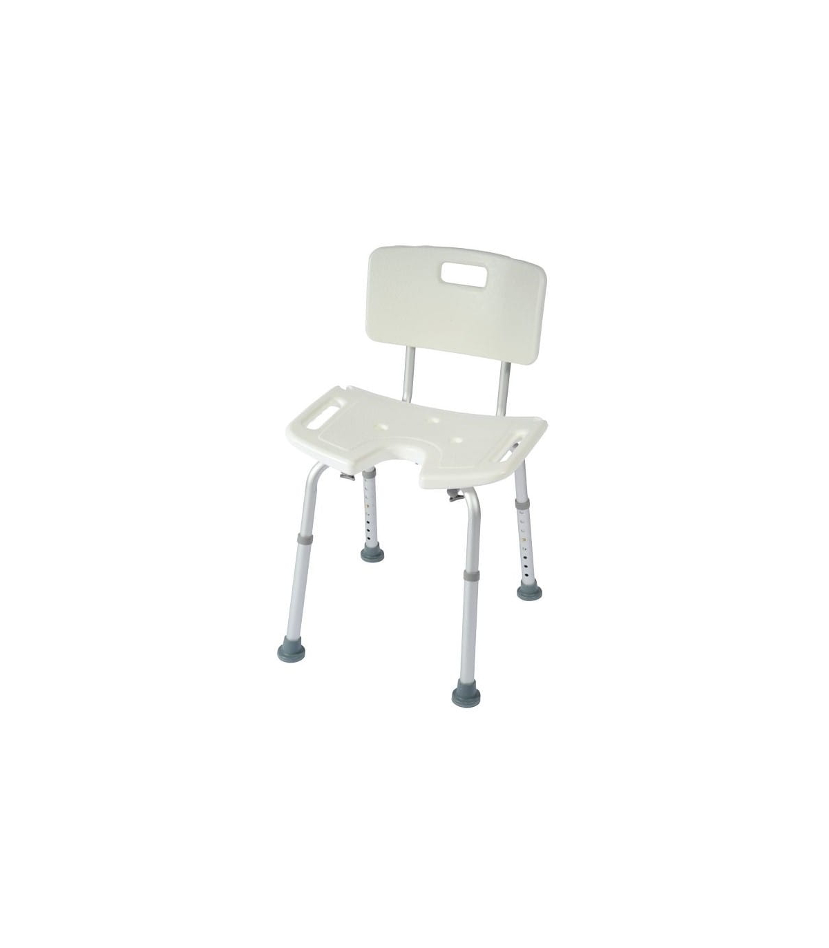 Pour assurer un maximum de sécurité, la chaise de douche New Bora comporte une surface grainée antidérapante ainsi que des pieds caoutchoutés pour une meilleure adhérence avec le sol.