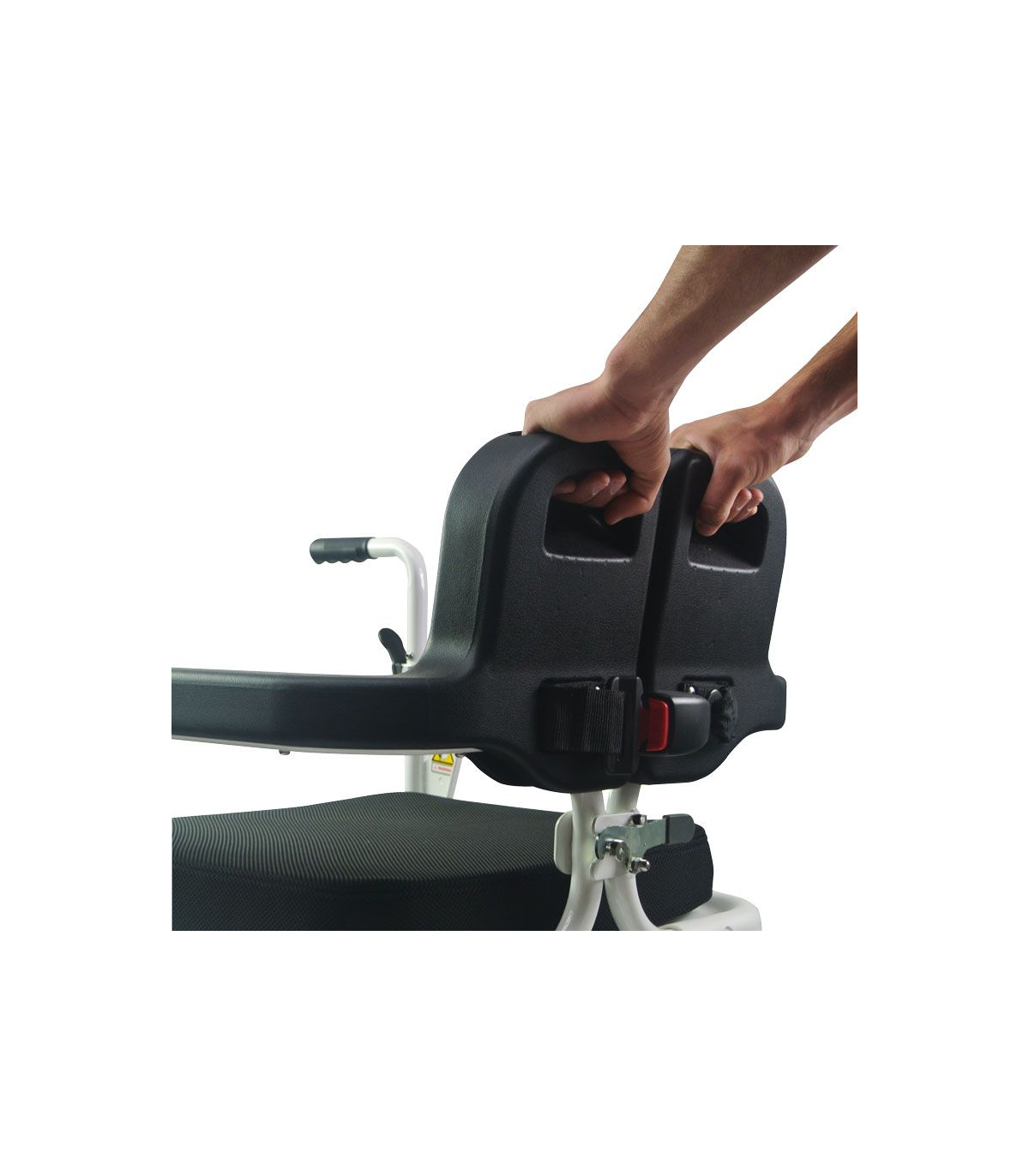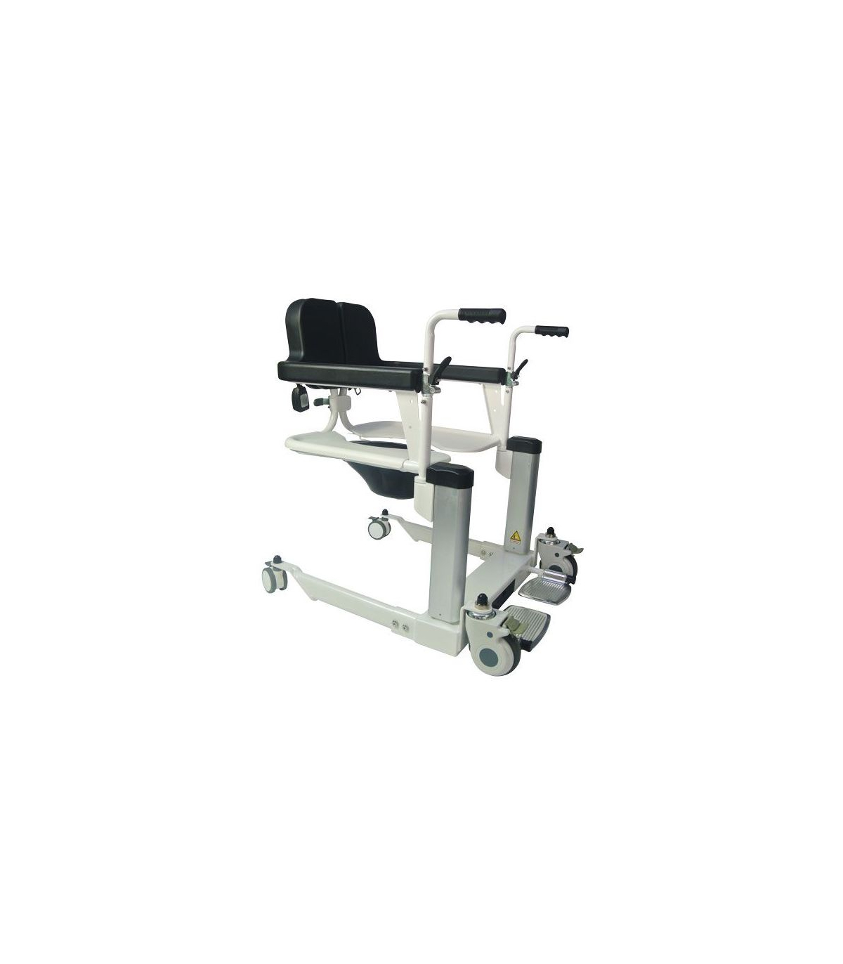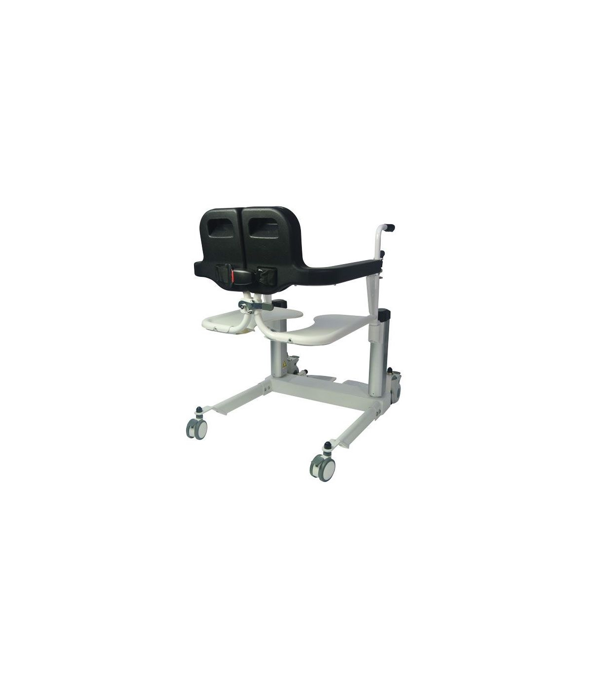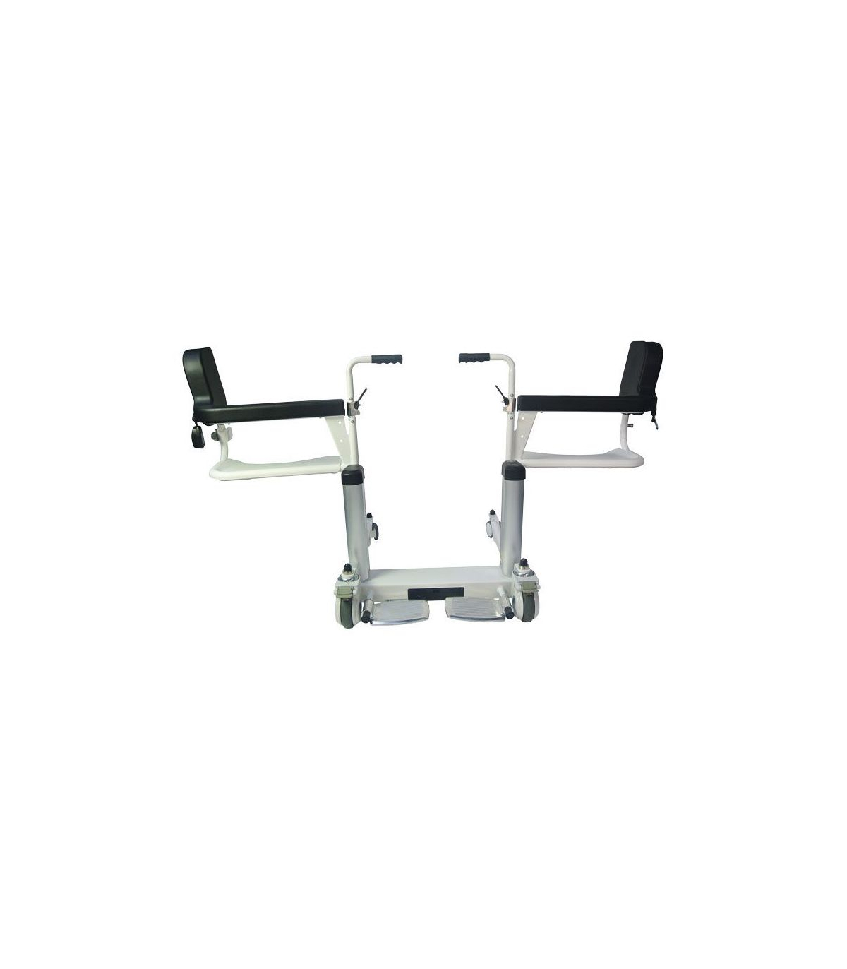 De plus, celui-ci est muni de 4 roues avec freins pour éviter que le siège roulant bouge durant le transfert.