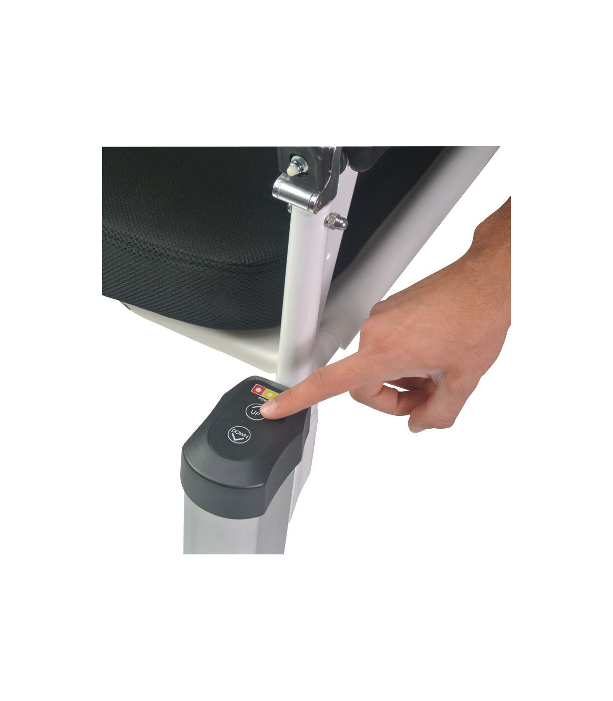 - Dans un premier temps, il suffit de positionner l'assise du siège à la hauteur du fessier de l'utilisateur grâce aux boutons monté/descendre.