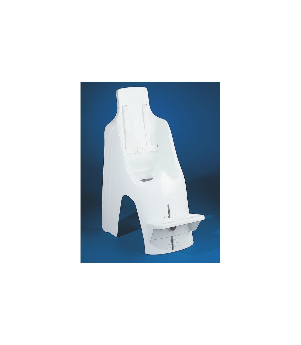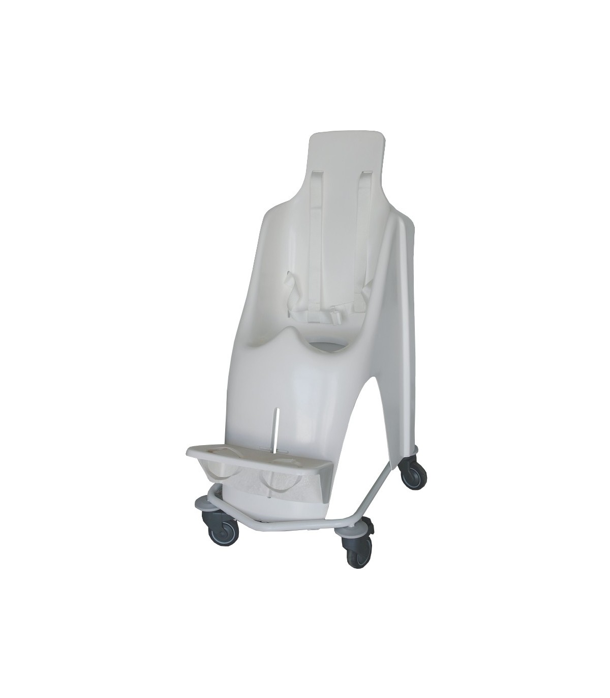 Celui-ci est équipé d'un large repose-pieds réglable en hauteur, d'un plot abducteur et d'un harnais 4 points pour éviter que l'enfant ne glisse vers l'avant.