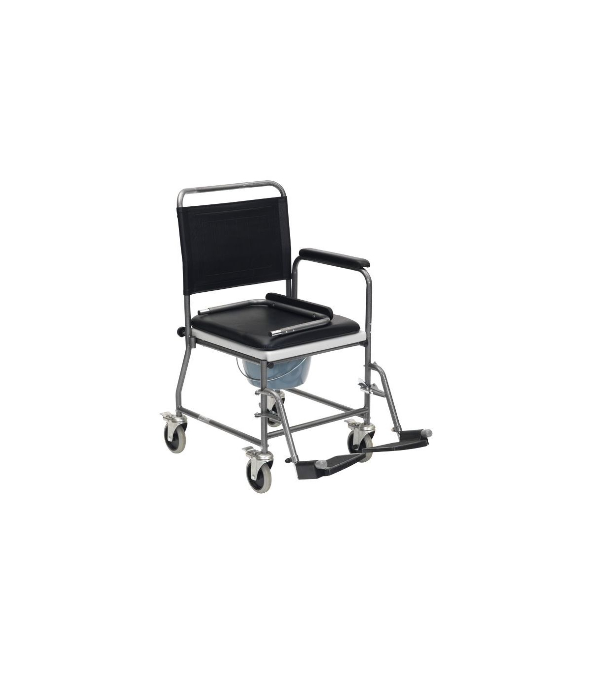 La chaise percée à roulettes avec accoudoirs escamotables appelée aussi "chaise garde-robe" est destinée aux personnes âgées, aux personnes à mobilité réduite (PMR) ainsi qu'aux personnes qui ont des difficultés pour se déplacer jusqu'aux toilettes.