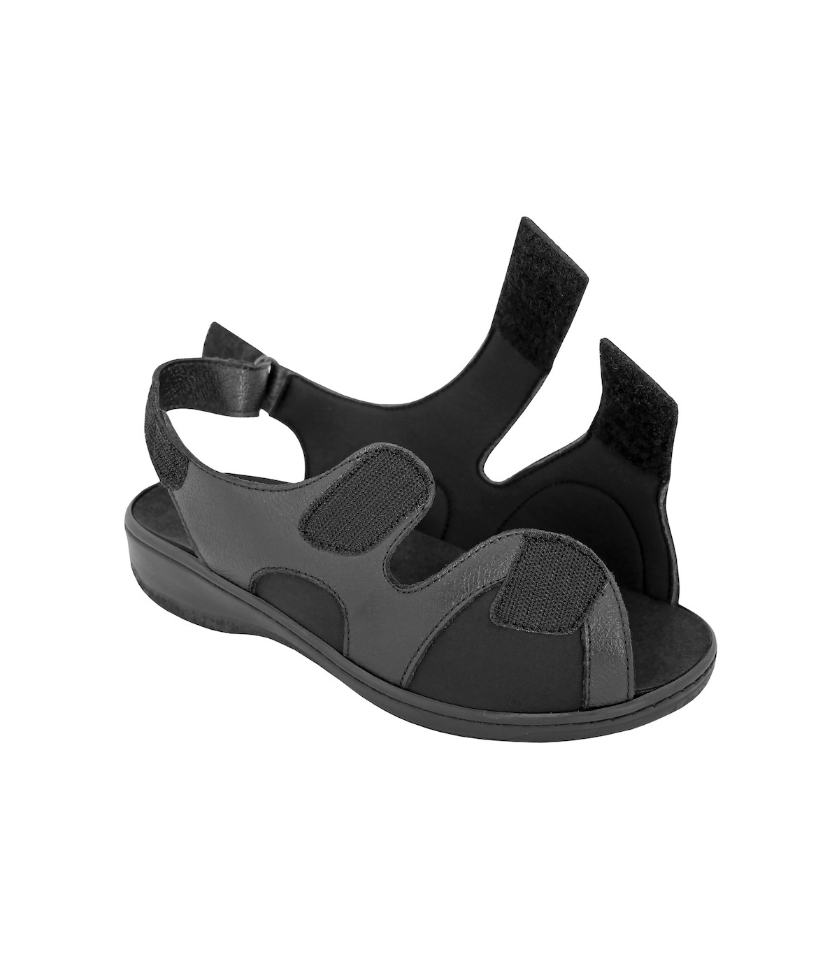 Les deux ouvertures sur le dessus et l'ouverture à l'arrière par bandes auto-agrippantes, permettent à l'utilisateur d'ouvrir complètement la chaussure pour faciliter le chaussage.