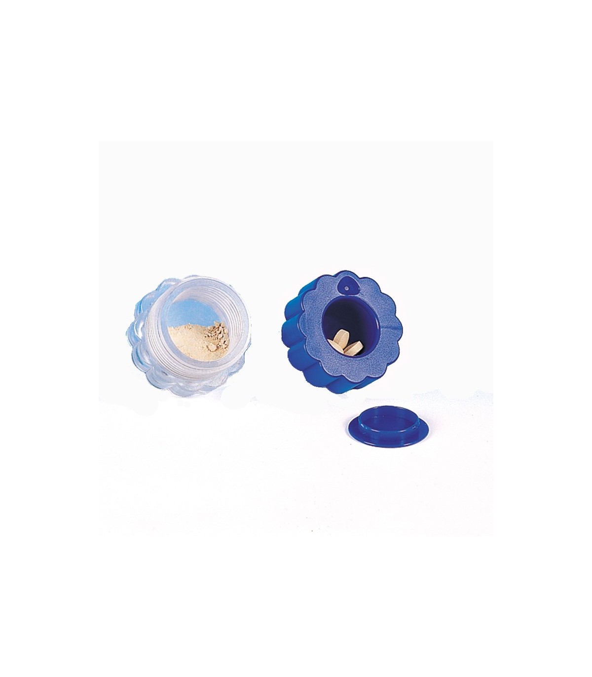 Il suffit de tourner simplement le gros écrou pour transformer en poudre les comprimés pouvant être également stockés dans un petit réceptacle.