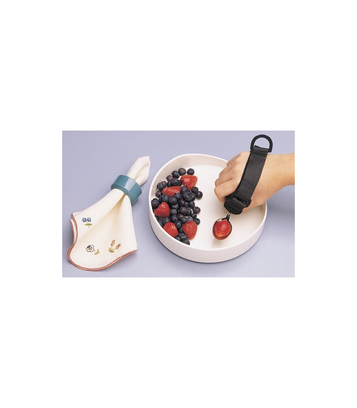 Cette poignée permet de fixer vos couverts usuels (fourchette, cuillère, couteau) pour une meilleure préhension sans effort.