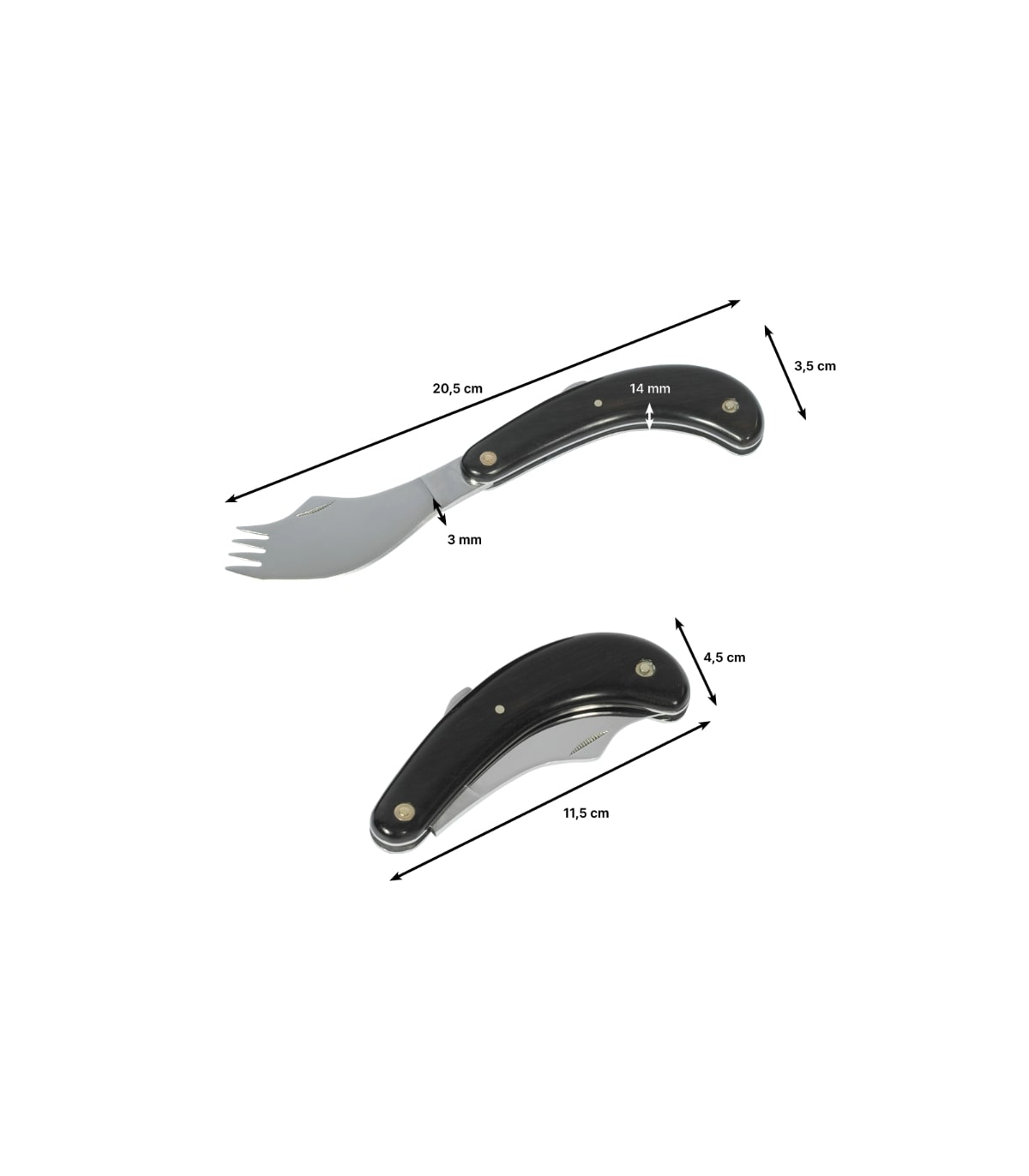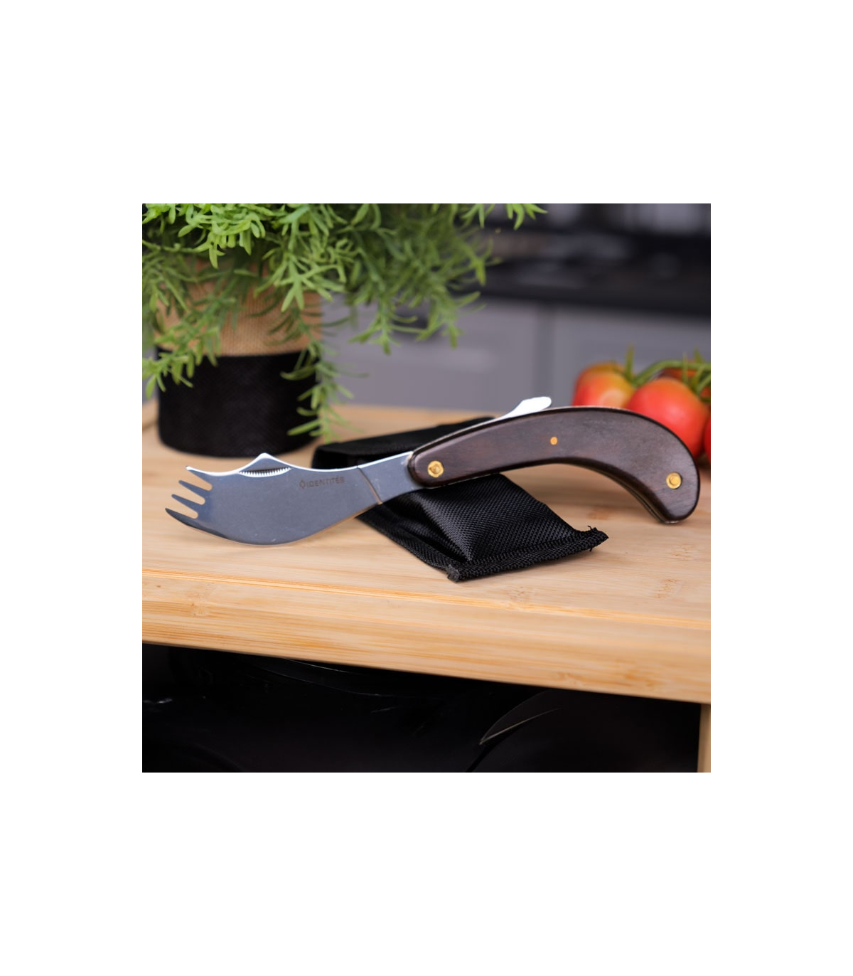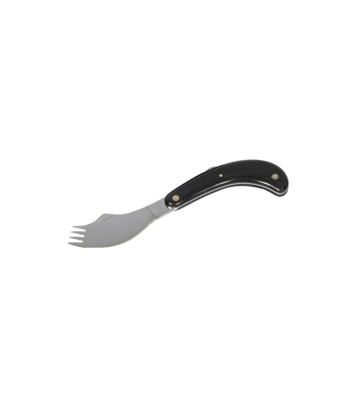 Le couteau fourchette pliable proposé à un prix attractif est équipé d'un manche en bois massif patiné pour plus de confort.