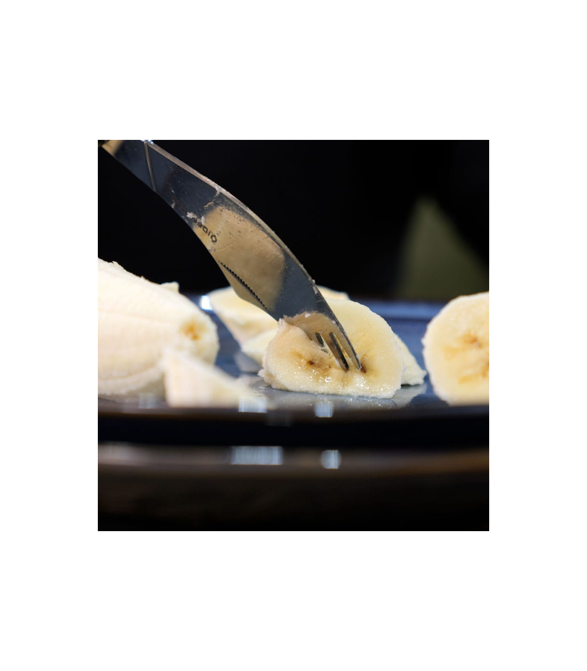 Pour permettre à l'utilisateur de manger à une seule main, ce produit comporte un couteau et une fourchette sur le même manche.