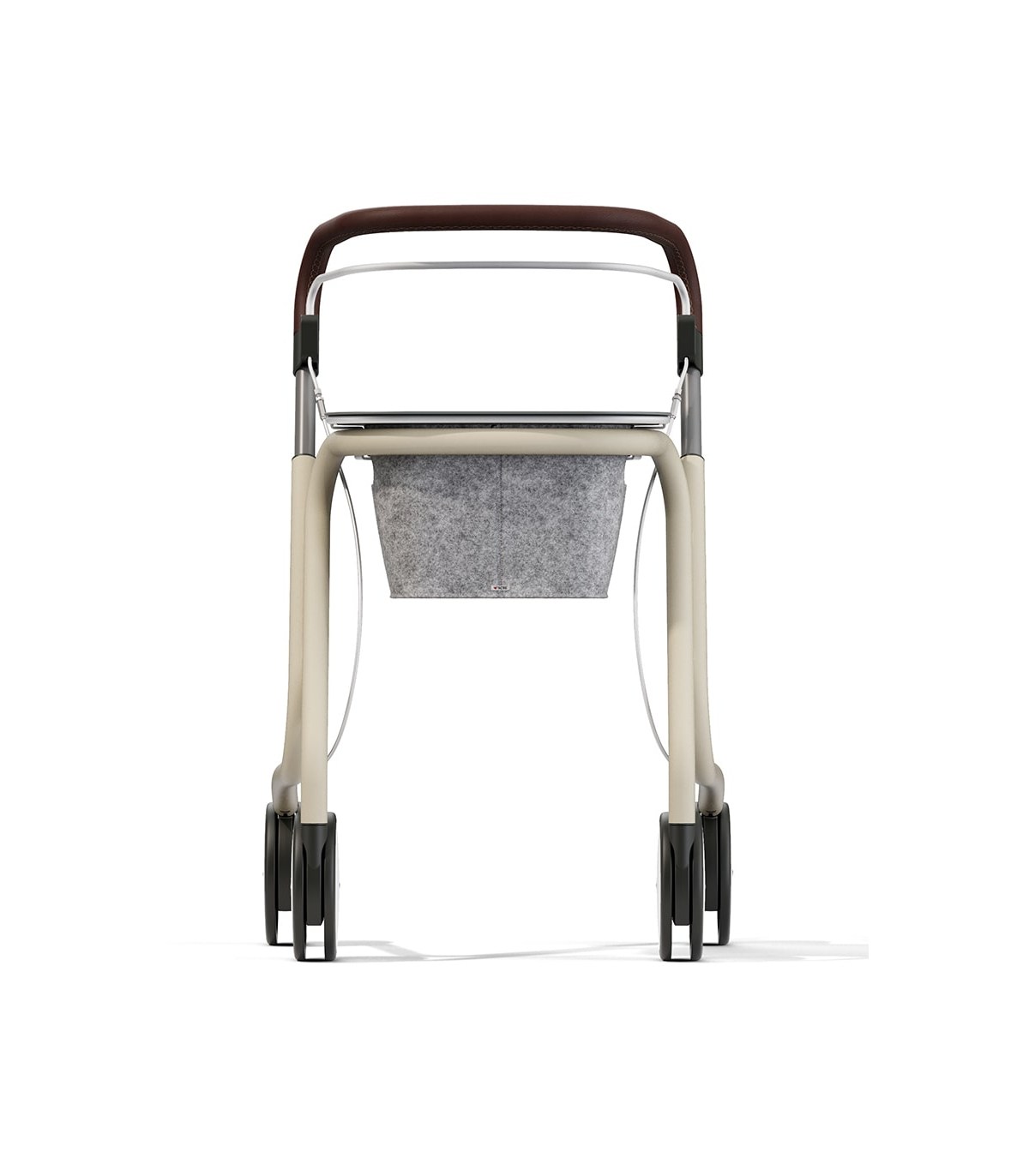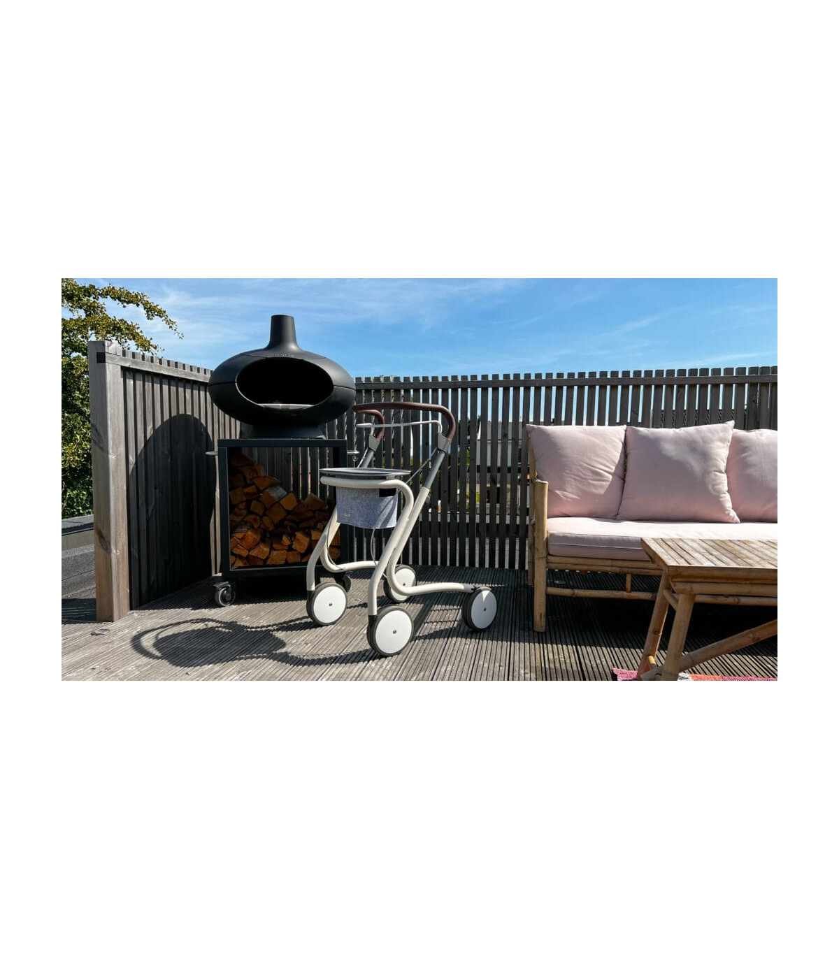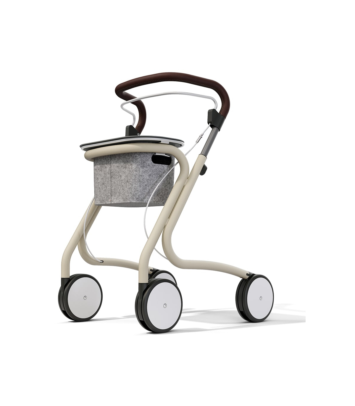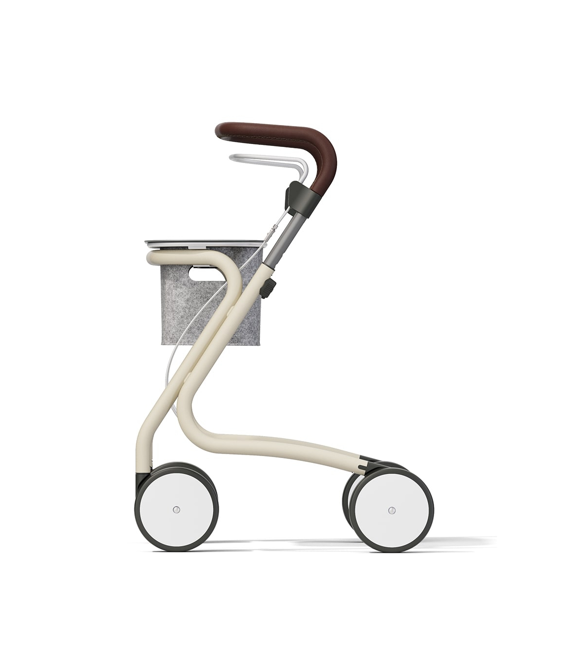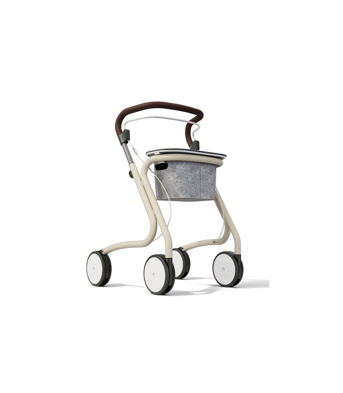 Le déambulateur roulant Scandinavian Butler est équipé de pneus en caoutchouc doux pour absorber efficacement les chocs.