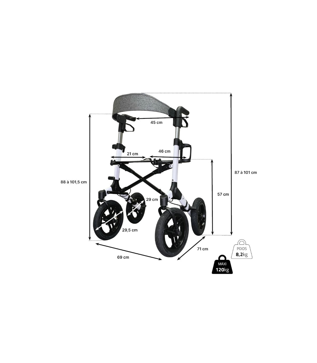 Caractéristiques techniques du déambulateur 4 roues tout terrain avec roues gonflables Neo Fun