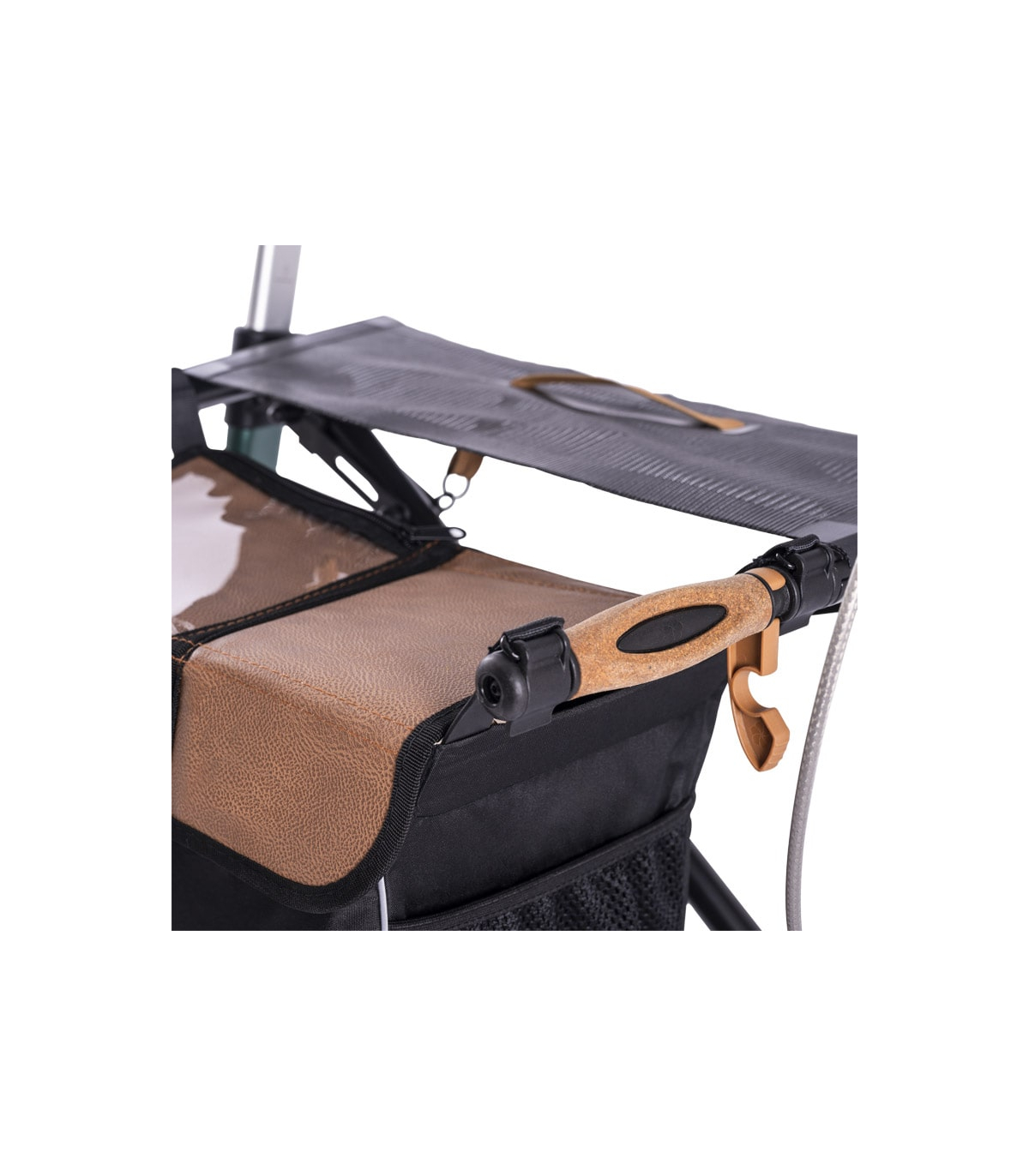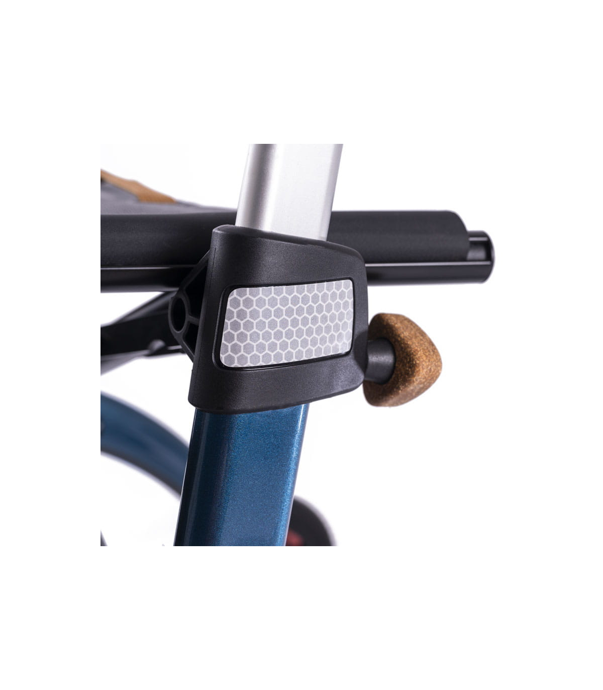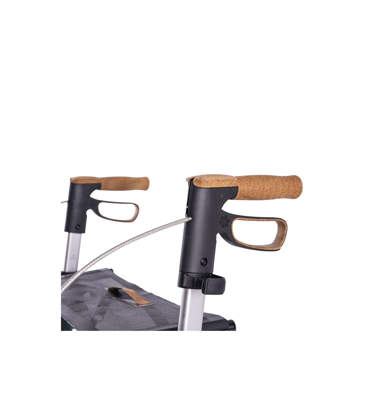 Pour une meilleure prise en main, les poignées du déambulateur Carbone Saljol sont recouvertes de liège. Vous trouverez aussi du liège sur les freins et les poignées de pliage pour davantage de confort.