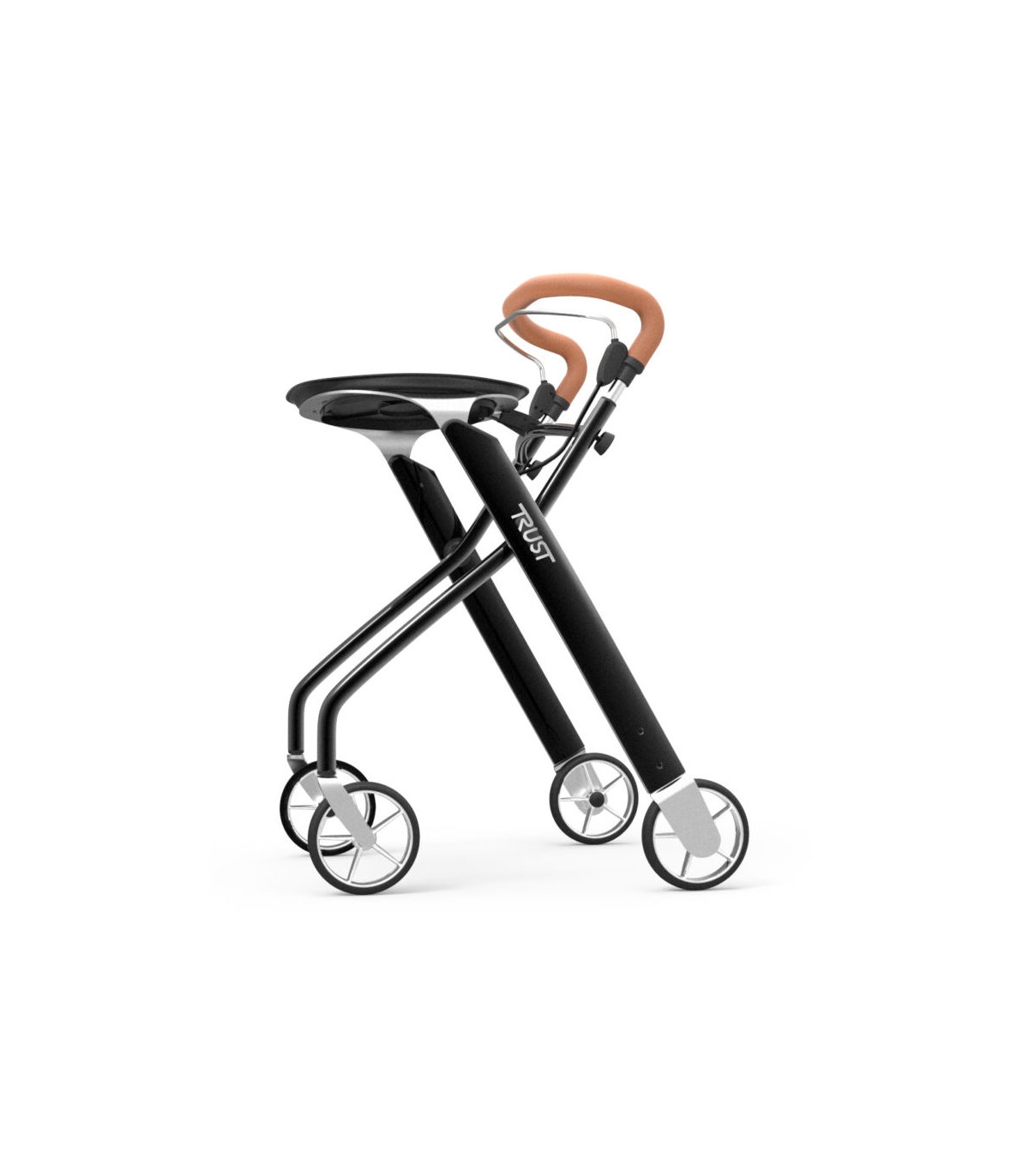 Le rollator maniable Let's Dream de la marque TrustCare dispose d'un plateau amovible sur lequel vous pouvez placer une assiette ou une tasse par exemple.