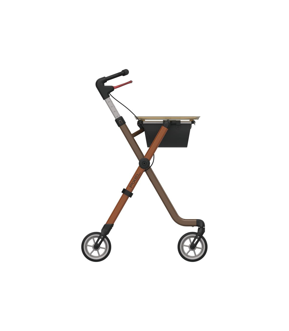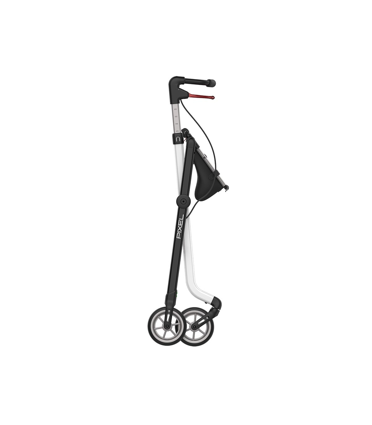 Le rollator Pixel est équipé de freins et de roues souples pour plus de maniabilité, même sur les surfaces mouillées.