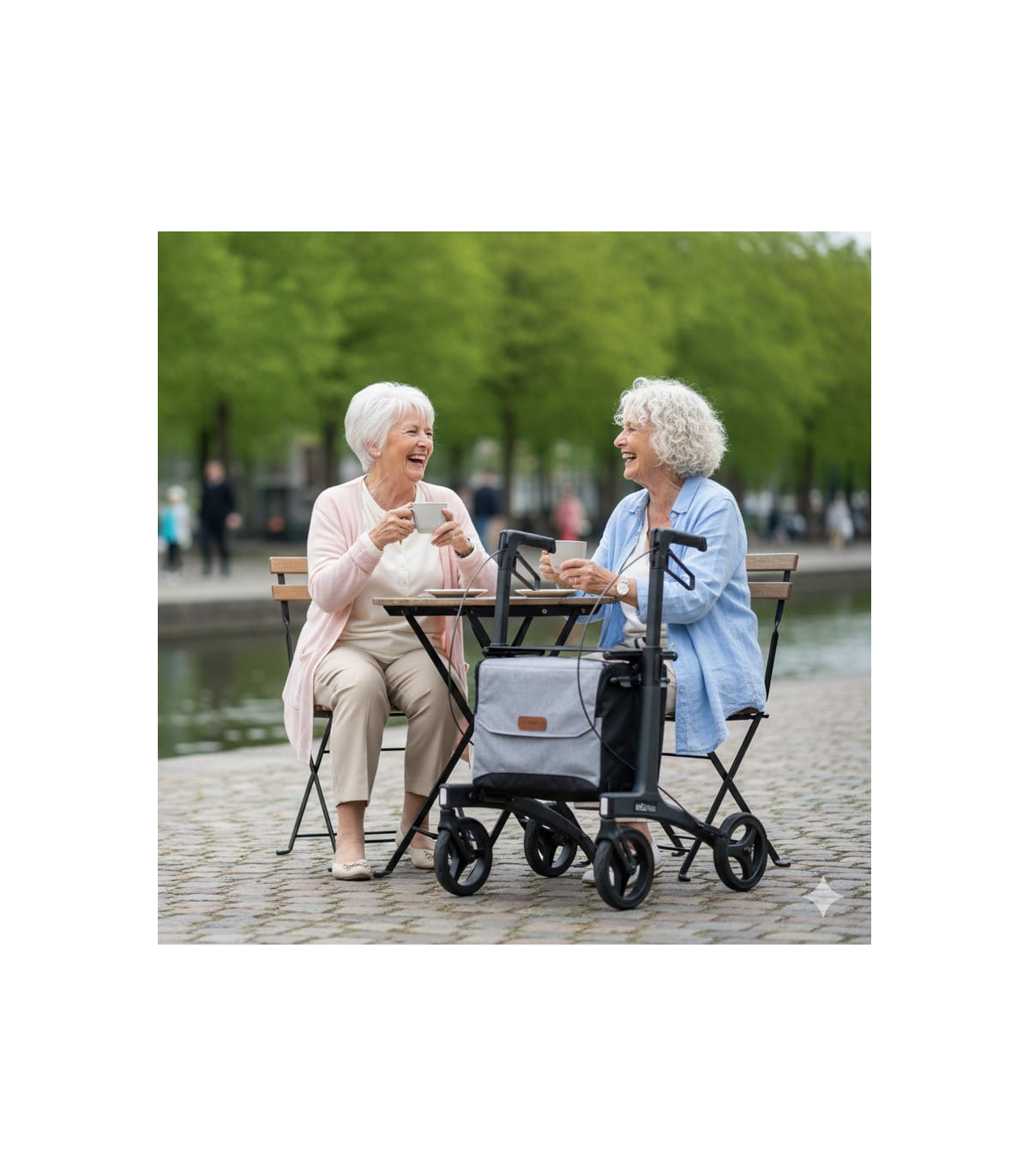 Le déambulateur 4 roues léger et pliable Rollz Flow permet à l'utilisateur de se déplacer aussi bien à l’intérieur qu’à l’extérieur (à la maison, dans la rue ou en magasin) tout en offrant un appui stable et sécurisé à chaque pas.