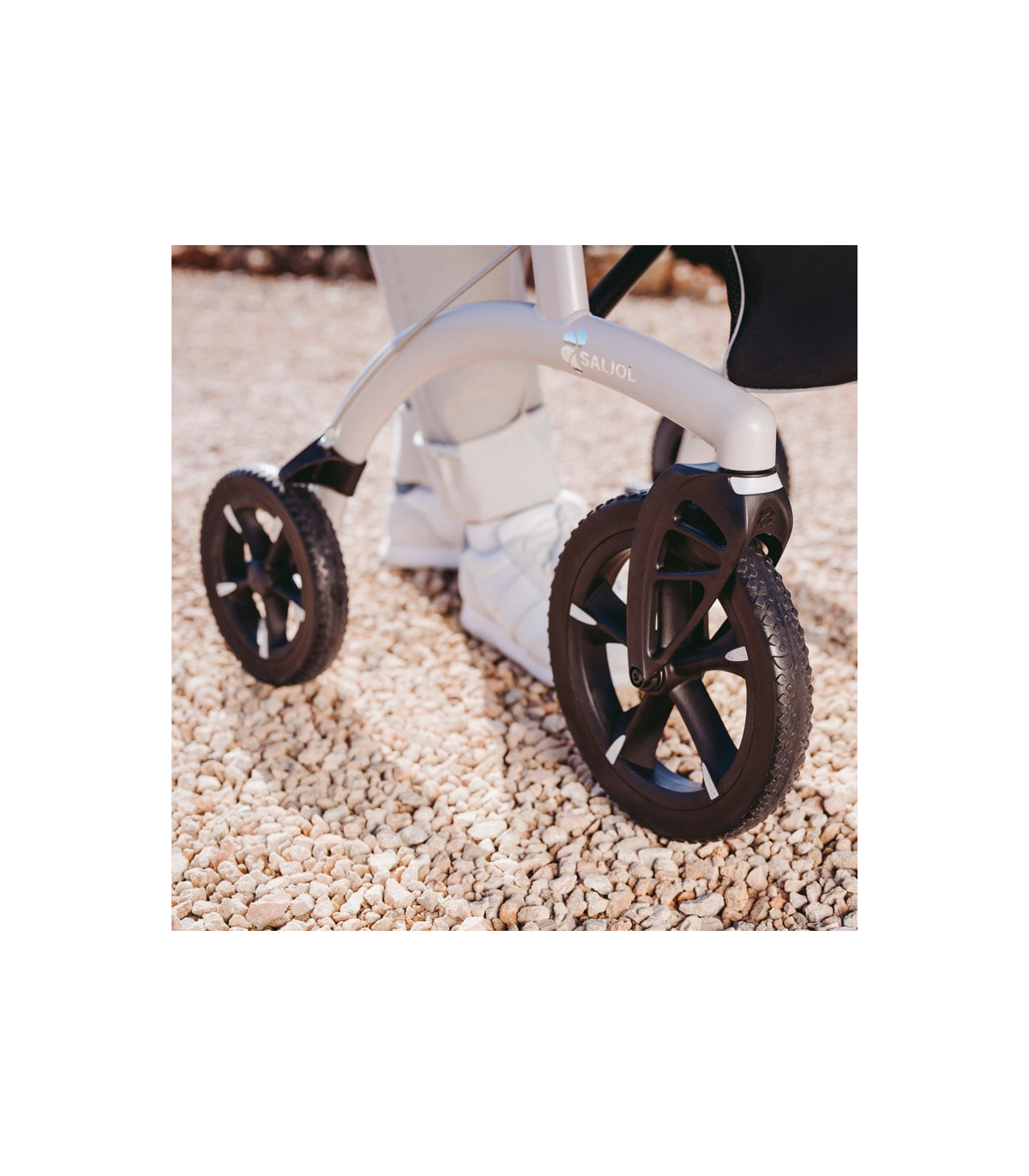 Les roues du rollator Saljol sont spécialement conçues pour absorber les chocs et faciliter la marche sur différents types de terrain. Avec un diamètre avant de 25 cm, ces roues assurent une excellente stabilité et une maniabilité optimale. Que ce soit pour se déplacer en intérieur ou en extérieur, elles permettent un déplacement fluide et sécurisé, réduisant ainsi les risques de chute.
