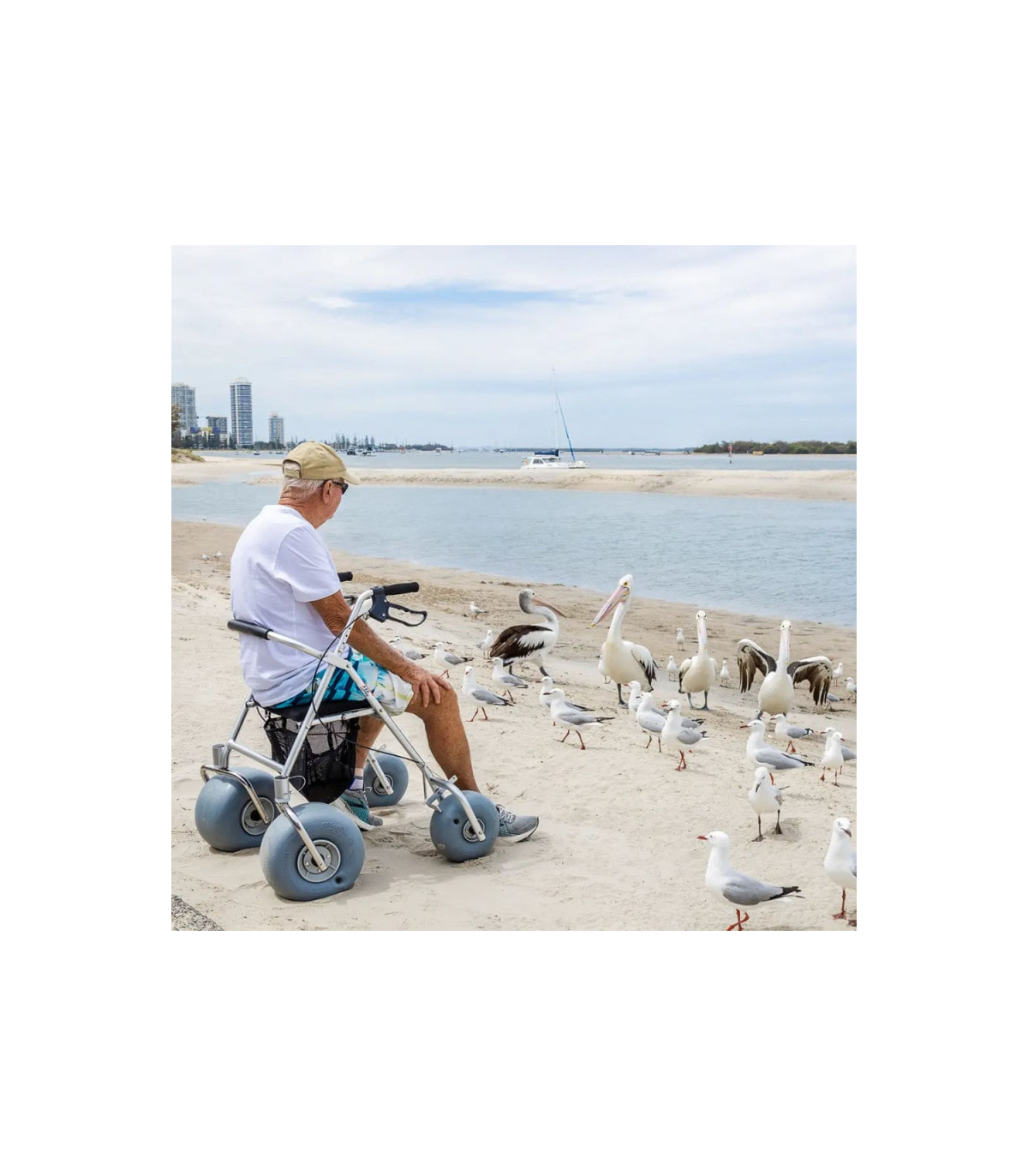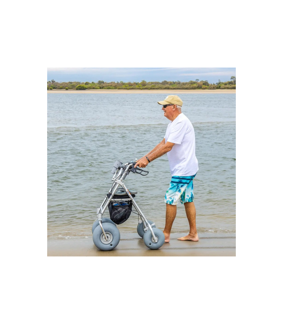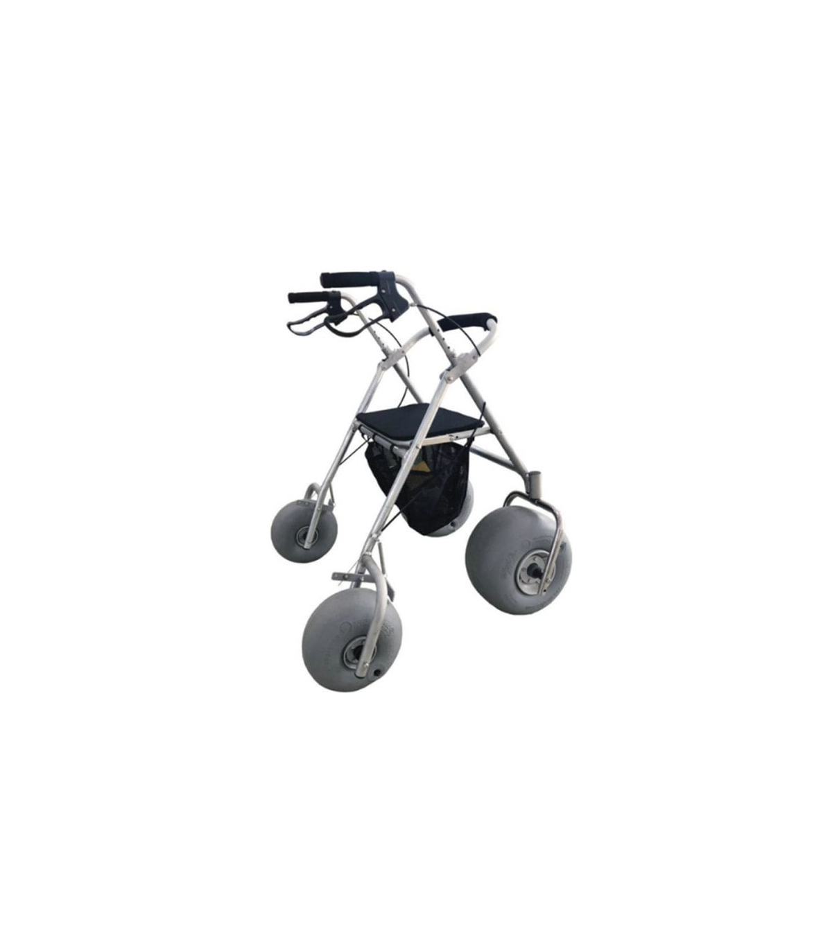 Le déambulateur 4 roues tout terrain pour la plage Wheeleez AccessWalk est un produit médical conçu pour offrir aux personnes à mobilité réduite (PMR) une liberté de déplacement sur tous types de terrains meubles, tels que le sable, le gazon ou les graviers. Grâce à ses roues ballon larges, son cadre en aluminium robuste et son système de freinage sécurisé, ce rollator de plage assure à la fois stabilité, confort et mobilité. C’est l’équipement idéal pour profiter pleinement de promenades en extérieur, que ce soit en bord de mer, en forêt ou sur des chemins irréguliers.