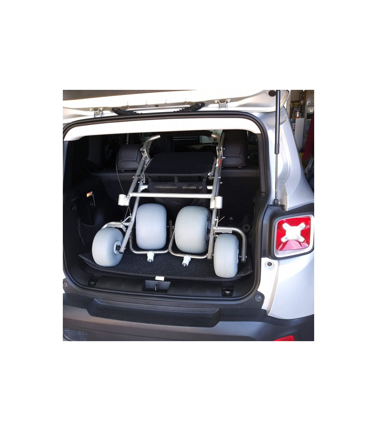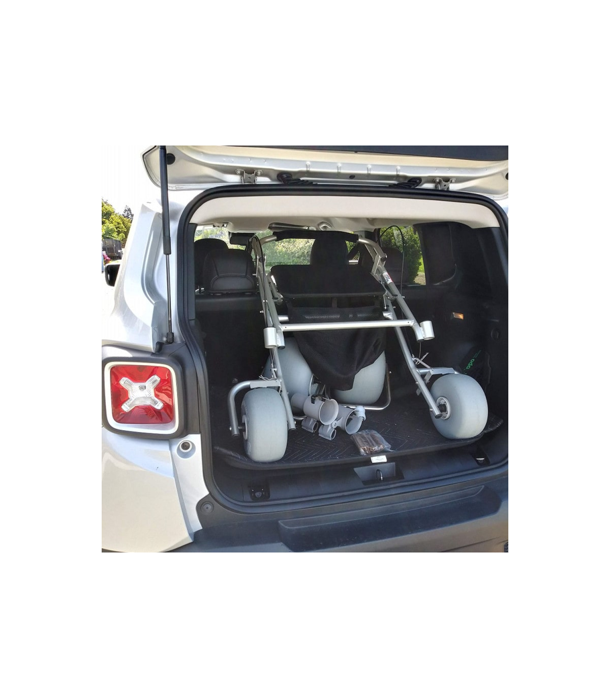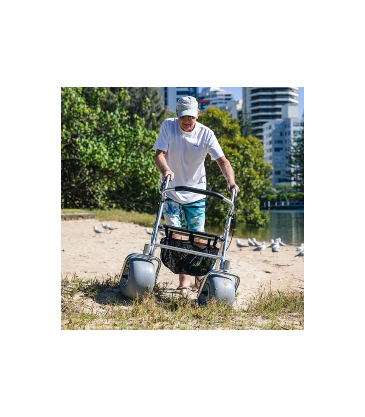 Avec son cadre en aluminium anodisé, ce déambulateur tout-terrain de plage pèse seulement 10 kg, tout en supportant une charge allant jusqu’à 120 kg. Son dossier rembourré, ses poignées en mousse et son siège de 41 x 28 cm apportent un confort optimal, même lors des pauses prolongées. La largeur totale de 90 cm permet une assise spacieuse et une bonne maniabilité sur les chemins.