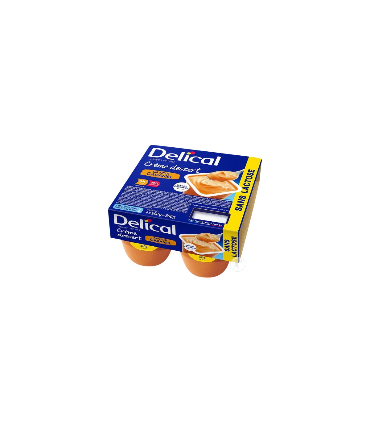 La crème dessert Delical HP HC est hyperprotidique et hypercalorique (360 kcal et 20 g de protéines / pot de 200 g).