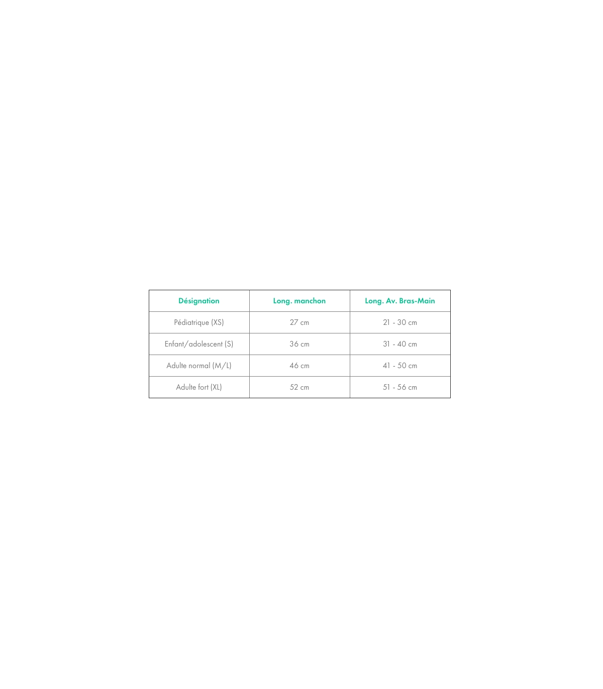 | Désignation | Long. manchon | Long. Av. Bras-Main |