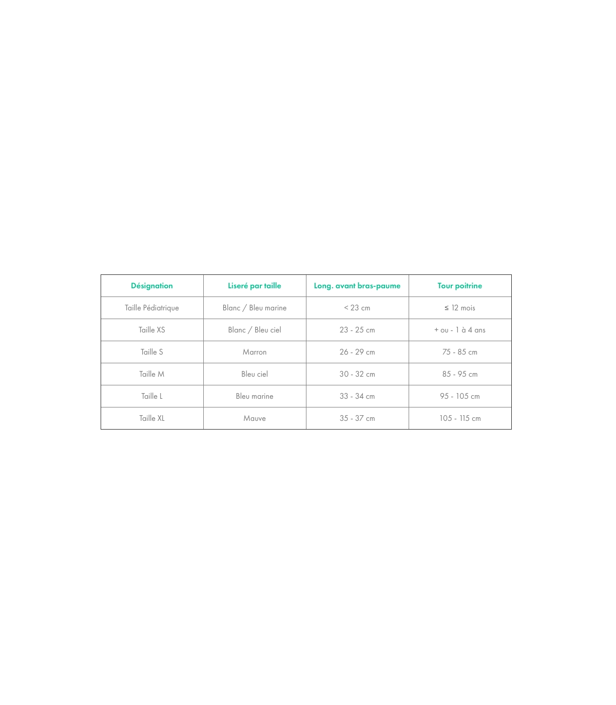 | Désignation | Liseré par taille | Long. avant bras-paume | Tour poitrine |